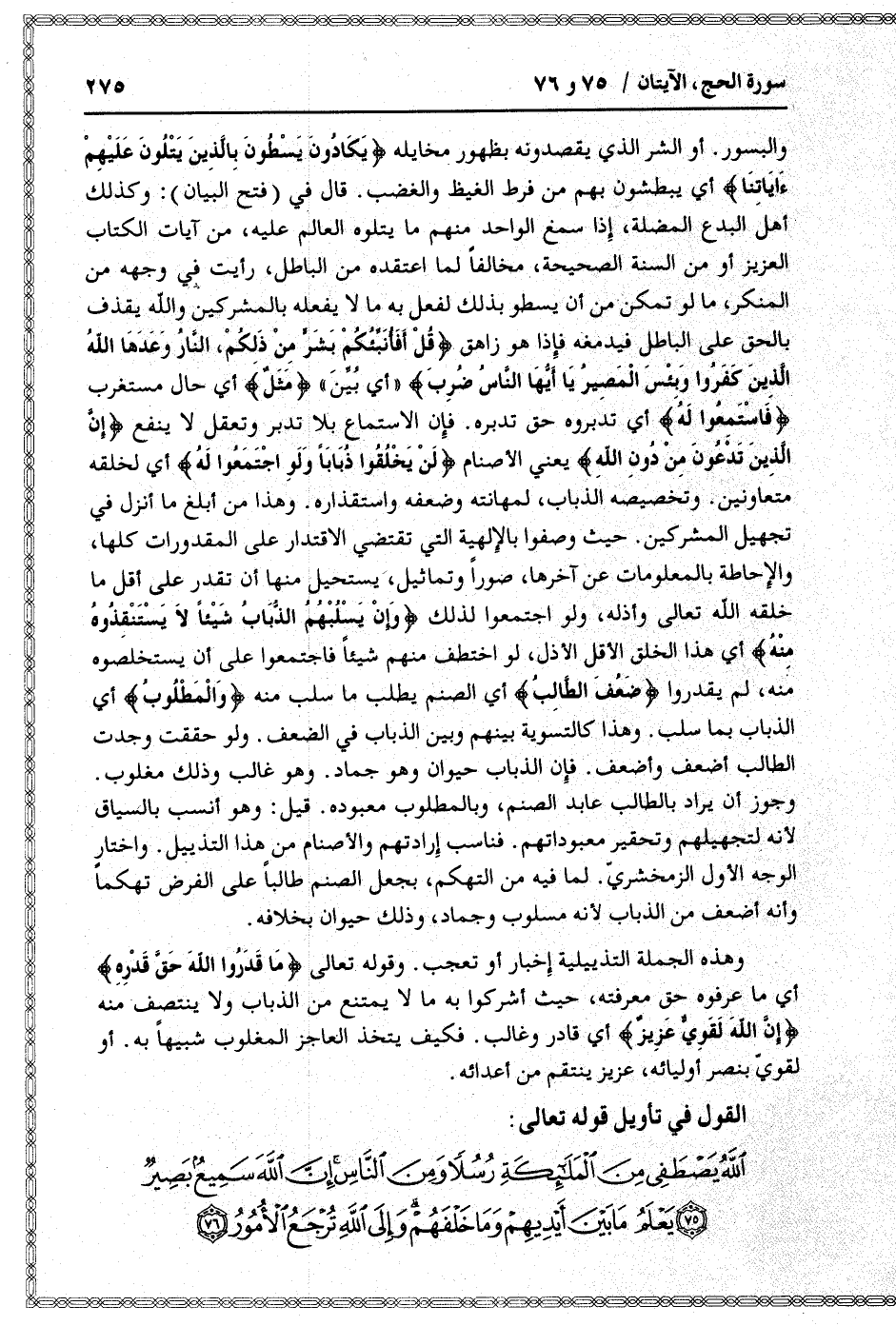 اللَّهُ يَصْطَفِي مِنَ الْمَلائِكَةِ رُسُلاً وَمِنَ النَّاسِ إِنَّ اللَّهَ سَمِيعٌ بَصِيرٌ (75) يَعْلَمُ ما بَيْنَ أَيْدِيهِمْ وَما خَلْفَهُمْ وَإِلَى اللَّهِ تُرْجَعُ الْأُمُورُ (76)