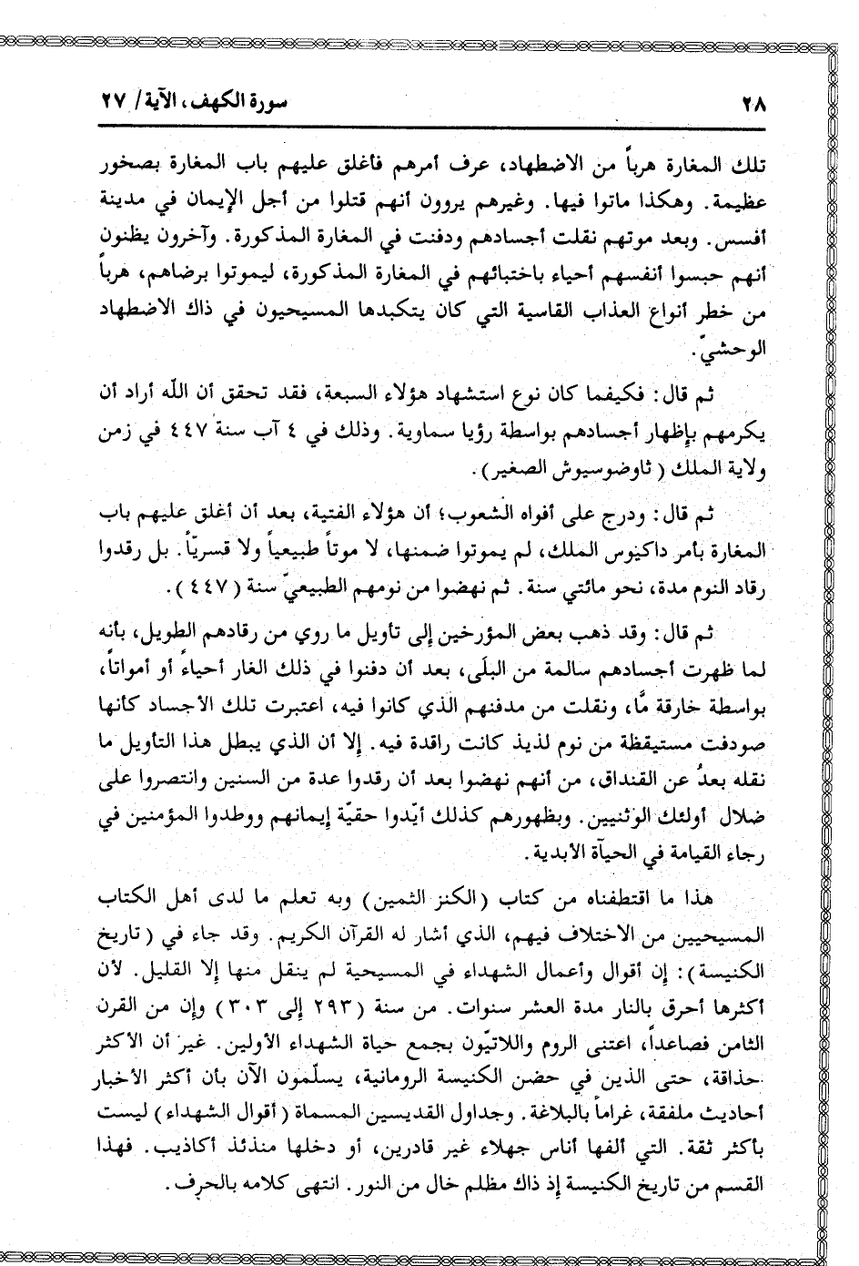 ثم قال: ودرج على أفواه الشعوب أن هؤلاء الفتية، بعد أن أغلق عليهم باب المغارة بأمر داكيوس الملك، لم يموتوا ضمنها، لا موتا طبيعيا ولا قسريّا. بل رقدوا رقاد النوم مدة، نحو مائتي سنة. ثم نهضوا من نومهم الطبيعيّ سنة (447) .