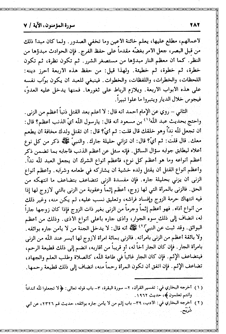 وأعظم أنواع القتل أن يقتل ولده خشية أن يشاركه في طعامه وشرابه. وأعظم أنواع الزنى أن يزني بحليلة جاره. فإن مفسدة الزنى تتضاعف بتضاعف ما انتهكه من الحق. فالزنى بالمرأة التي لها زوج، أعظم إثما وعقوبة من الزنى بالتي لا زوج لها إذا فيه انتهاك حرمة الزوج وإفساد فراشه، وتعليق نسب عليه، لم يكن منه، وغير ذلك من أنواع أذاه. فهو أعظم إثما وجرما من الزنى بغير ذات الزوج فإذا كان زوجها جارا له، انضاف إلى ذلك سوء الجوار، وأذى جاره بأعلى أنواع الأذى. وذلك من أعظم البوائق.