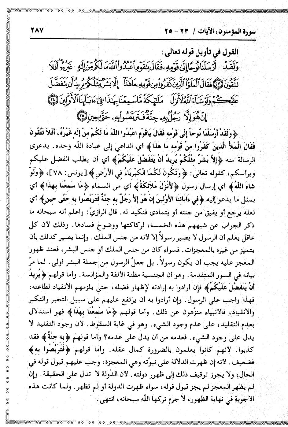 وَلَقَدْ أَرْسَلْنا نُوحاً إِلى قَوْمِهِ فَقالَ يا قَوْمِ اعْبُدُوا اللَّهَ ما لَكُمْ مِنْ إِلهٍ غَيْرُهُ أَفَلا تَتَّقُونَ (23) فَقالَ الْمَلَأُ الَّذِينَ كَفَرُوا مِنْ قَوْمِهِ ما هذا إِلاَّ بَشَرٌ مِثْلُكُمْ يُرِيدُ أَنْ يَتَفَضَّلَ عَلَيْكُمْ وَلَوْ شاءَ اللَّهُ لَأَنْزَلَ مَلائِكَةً ما سَمِعْنا بِهذا فِي آبائِنَا الْأَوَّلِينَ (24) إِنْ هُوَ إِلاَّ رَجُلٌ بِهِ جِنَّةٌ فَتَرَبَّصُوا بِهِ حَتَّى حِينٍ (25)