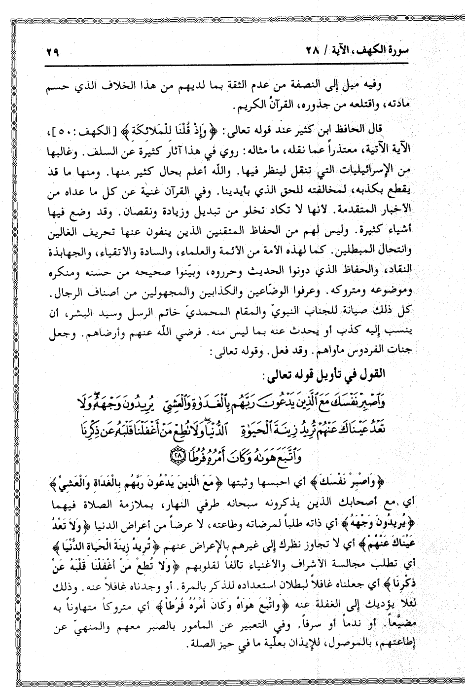 وَاصْبِرْ نَفْسَكَ مَعَ الَّذِينَ يَدْعُونَ رَبَّهُمْ بِالْغَداةِ وَالْعَشِيِّ يُرِيدُونَ وَجْهَهُ وَلا تَعْدُ عَيْناكَ عَنْهُمْ تُرِيدُ زِينَةَ الْحَياةِ الدُّنْيا وَلا تُطِعْ مَنْ أَغْفَلْنا قَلْبَهُ عَنْ ذِكْرِنا وَاتَّبَعَ هَواهُ وَكانَ أَمْرُهُ فُرُطاً (28)