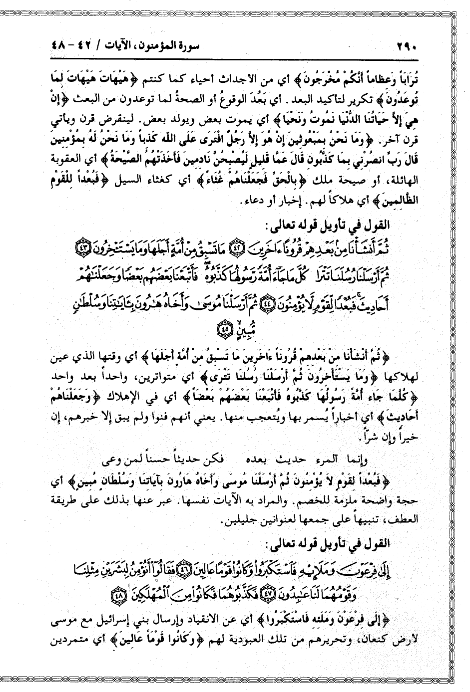 ثُمَّ أَنْشَأْنا مِنْ بَعْدِهِمْ قُرُوناً آخَرِينَ (42) ما تَسْبِقُ مِنْ أُمَّةٍ أَجَلَها وَما يَسْتَأْخِرُونَ (43) ثُمَّ أَرْسَلْنا رُسُلَنا تَتْرا كُلَّ ما جاءَ أُمَّةً رَسُولُها كَذَّبُوهُ فَأَتْبَعْنا بَعْضَهُمْ بَعْضاً وَجَعَلْناهُمْ أَحادِيثَ فَبُعْداً لِقَوْمٍ لا يُؤْمِنُونَ (44) ثُمَّ أَرْسَلْنا مُوسى وَأَخاهُ هارُونَ بِآياتِنا وَسُلْطانٍ مُبِينٍ (45)