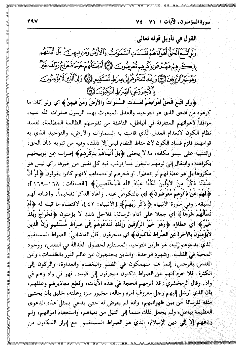 وَلَوِ اتَّبَعَ الْحَقُّ أَهْواءَهُمْ لَفَسَدَتِ السَّماواتُ وَالْأَرْضُ وَمَنْ فِيهِنَّ بَلْ أَتَيْناهُمْ بِذِكْرِهِمْ فَهُمْ عَنْ ذِكْرِهِمْ مُعْرِضُونَ (71) أَمْ تَسْأَلُهُمْ خَرْجاً فَخَراجُ رَبِّكَ خَيْرٌ وَهُوَ خَيْرُ الرَّازِقِينَ (72) وَإِنَّكَ لَتَدْعُوهُمْ إِلى صِراطٍ مُسْتَقِيمٍ (73) وَإِنَّ الَّذِينَ لا يُؤْمِنُونَ بِالْآخِرَةِ عَنِ الصِّراطِ لَناكِبُونَ (74)