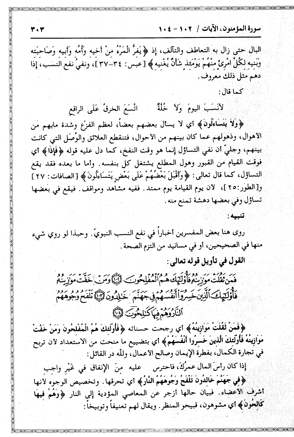 فَمَنْ ثَقُلَتْ مَوازِينُهُ فَأُولئِكَ هُمُ الْمُفْلِحُونَ (102) وَمَنْ خَفَّتْ مَوازِينُهُ فَأُولئِكَ الَّذِينَ خَسِرُوا أَنْفُسَهُمْ فِي جَهَنَّمَ خالِدُونَ (103) تَلْفَحُ وُجُوهَهُمُ النَّارُ وَهُمْ فِيها كالِحُونَ (104)