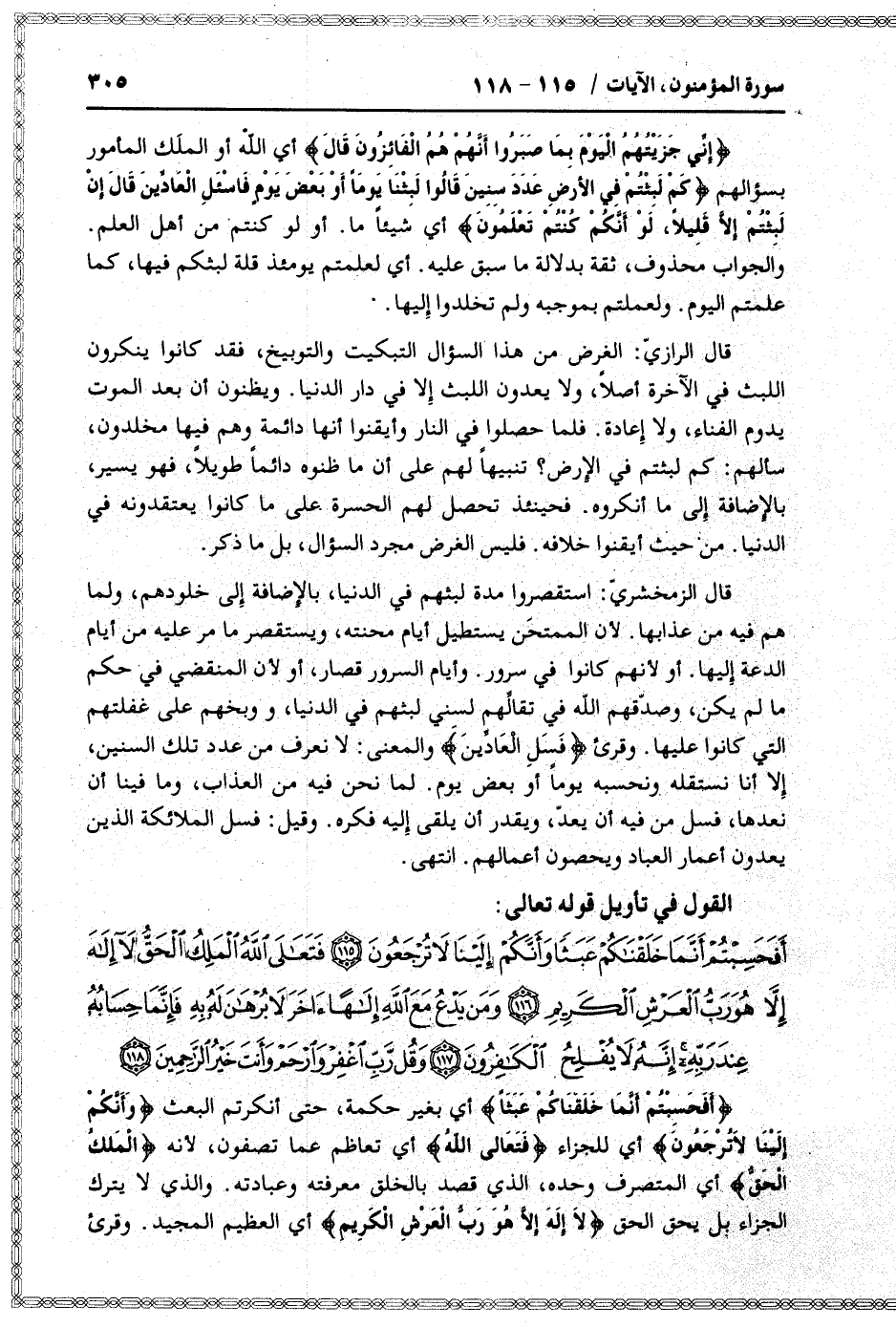 أَفَحَسِبْتُمْ أَنَّما خَلَقْناكُمْ عَبَثاً وَأَنَّكُمْ إِلَيْنا لا تُرْجَعُونَ (115) فَتَعالَى اللَّهُ الْمَلِكُ الْحَقُّ لا إِلهَ إِلاَّ هُوَ رَبُّ الْعَرْشِ الْكَرِيمِ (116) وَمَنْ يَدْعُ مَعَ اللَّهِ إِلهاً آخَرَ لا بُرْهانَ لَهُ بِهِ فَإِنَّما حِسابُهُ عِنْدَ رَبِّهِ إِنَّهُ لا يُفْلِحُ الْكافِرُونَ (117) وَقُلْ رَبِّ اغْفِرْ وَارْحَمْ وَأَنْتَ خَيْرُ الرَّاحِمِينَ (118)