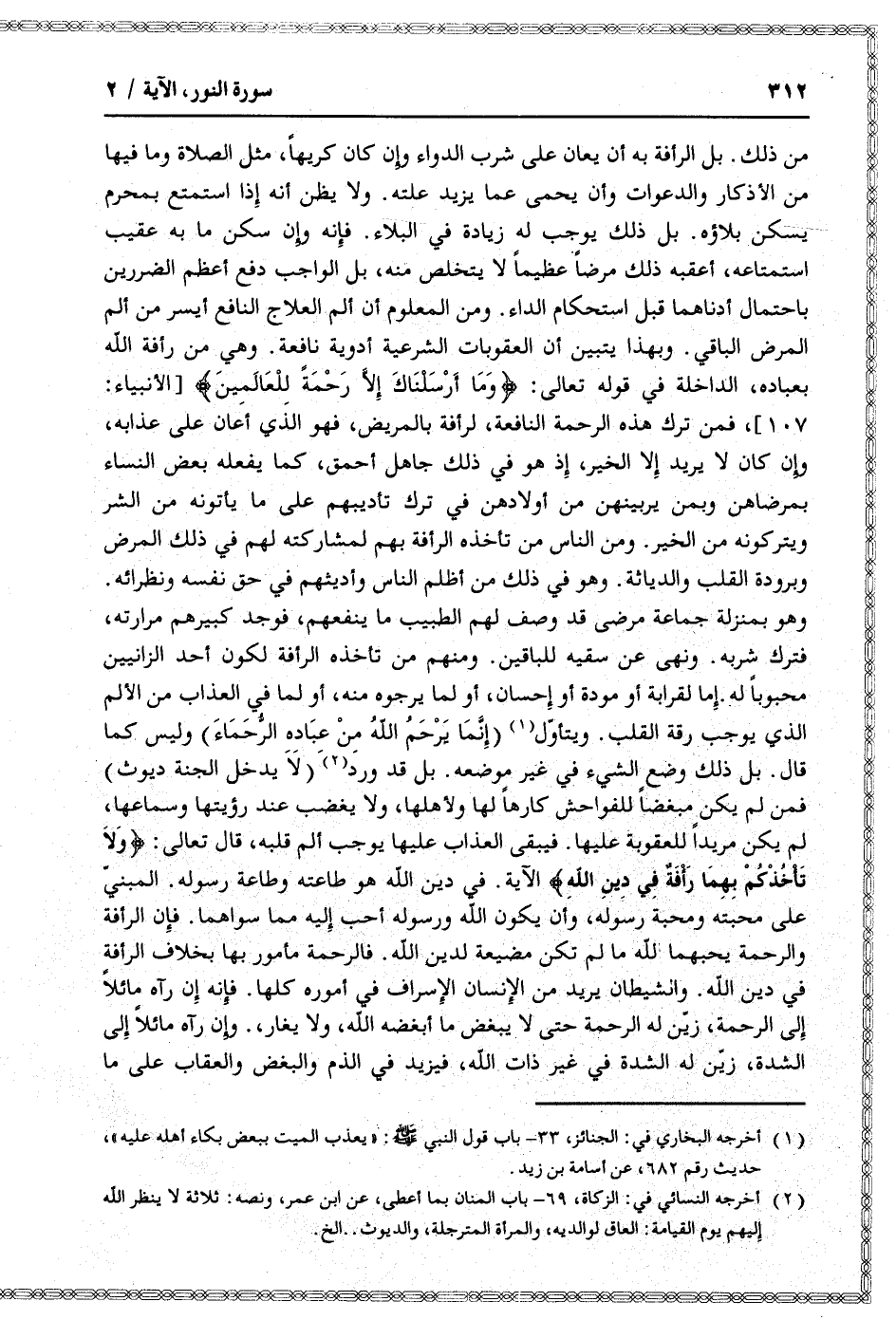وهو بمنزلة جماعة مرضى قد وصف لهم الطبيب ما ينفعهم، فوجد كبيرهم مرارته، فترك شربه. ونهى عن سقيه للباقين. ومنهم من تأخذه الرأفة لكون أحد الزانيين محبوبا له. إما لقرابة أو مودة أو إحسان، أو لما يرجوه منه، أو لما في العذاب من الألم الذي يوجب رقة القلب. ويتأوّل «1»