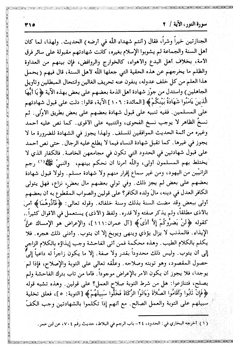 الحديث. ولهذا، لما كان أهل السنة والجماعة لم يشوبوا الإسلام بغيره، كانت شهادتهم مقبولة على سائر فرق الأمة، بخلاف أهل البدع والأهواء، كالخوارج والروافض، فإن بينهم من العداوة والظلم ما يخرجهم عن هذه الحقية التي جعلها الله لأهل السنة، قال فيهم (يحمل هذا العلم من كل خلف عدوله، ينفون عنه تحريف الغالين وانتحال المبطلين وتأويل الجاهلين) واستدل من جوّز شهادة أهل الذمة بعضهم على بعض بهذه الآية يا أَيُّهَا الَّذِينَ آمَنُوا شَهادَةُ بَيْنِكُمْ [المائدة: 106] الآية، قالوا: دلت على قبول شهادتهم على المسلمين. ففيه تنبيه على قبول شهادة بعضهم على بعض بطريق الأولى. ثم نسخ الظاهر لا يوجب نسخ الفحوى، والتنبيه على الأقوى. كما نص عليه أحمد وغيره من أئمة الحديث الموافقين للسلف. ولهذا يجوز في الشهادة للضرورة ما لا يجوز في غيرها. كما تقبل شهادة النساء فيما لا يطلع عليه الرجال. حتى نص أحمد على قبول شهادتين في الحدود التي تكون في مجامعهن الخاصة. فالكفار الذي لا يختلط بهم المسلمون أولى، والله أمرنا أن نحكم بينهم، والنبيّ صلى الله عليه وسلم «1» رجم الزانيين من اليهود، ومن غير سماع إقرار منهم ولا شهادة مسلم. ولولا قبول شهادة بعضهم على بعض لم يجز ذلك. وفي تولي بعضهم مال بعض، نزاع، فهل يتولى الكافر العدل في دينه، مال ولده الكافر؟ على قولين والصواب المقطوع به أن بعضهم أولى ببعض وقد مضت السنة بذلك وسنة خلفائه. وقوله تعالى: فَآذُوهُما أمر.