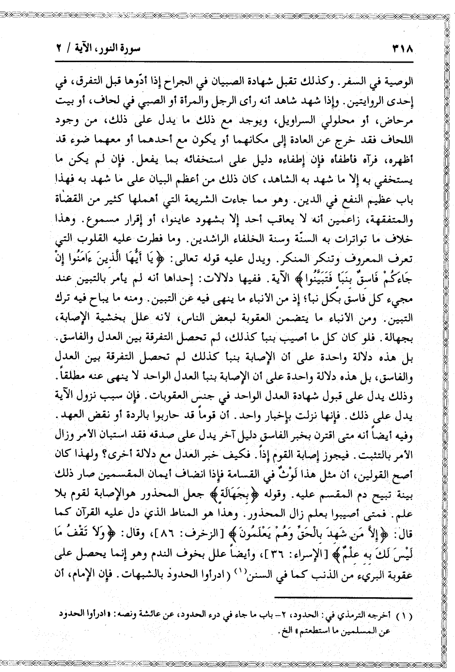 الوصية في السفر. وكذلك تقبل شهادة الصبيان في الجراح إذا أدّوها قبل التفرق، في إحدى الروايتين. وإذا شهد شاهد أنه رأى الرجل والمرأة أو الصبي في لحاف، أو بيت مرحاض، أو محلولي السراويل، ويوجد مع ذلك ما يدل على ذلك، من وجود اللحاف فقد خرج عن العادة إلى مكانهما أو يكون مع أحدهما أو معهما ضوء قد أظهره، فرآه فأطفأه فإن إطفاءه دليل على استخفائه بما يفعل. فإن لم يكن ما يستخفي به إلا ما شهد به الشاهد، كان ذلك من أعظم البيان على ما شهد به فهذا باب عظيم النفع في الدين. وهو مما جاءت الشريعة التي أهملها كثير من القضاة والمتفقهة، زاعمين أنه لا يعاقب أحد إلا بشهود عاينوا، أو إقرار مسموع. وهذا خلاف ما تواترات به السنّة وسنة الخلفاء الراشدين. وما فطرت عليه القلوب التي تعرف المعروف وتنكر المنكر. ويدل عليه قوله تعالى: يا أَيُّهَا الَّذِينَ آمَنُوا إِنْ جاءَكُمْ فاسِقٌ بِنَبَإٍ فَتَبَيَّنُوا الآية. ففيها دلالات: إحداها أنه لم يأمر بالتبين عند مجيء كل فاسق بكل نبأ إذ من الأنباء ما ينهى فيه عن التبين. ومنه ما يباح فيه ترك التبين. ومن الأنباء ما يتضمن العقوبة لبعض الناس، لأنه علل بخشية الإصابة، بجهالة. فلو كان كل ما أصيب بنبإ كذلك، لم تحصل التفرقة بين العدل والفاسق.