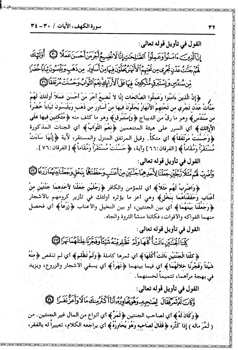 إِنَّ الَّذِينَ آمَنُوا وَعَمِلُوا الصَّالِحاتِ إِنَّا لا نُضِيعُ أَجْرَ مَنْ أَحْسَنَ عَمَلاً (30) أُولئِكَ لَهُمْ جَنَّاتُ عَدْنٍ تَجْرِي مِنْ تَحْتِهِمُ الْأَنْهارُ يُحَلَّوْنَ فِيها مِنْ أَساوِرَ مِنْ ذَهَبٍ وَيَلْبَسُونَ ثِياباً خُضْراً مِنْ سُنْدُسٍ وَإِسْتَبْرَقٍ مُتَّكِئِينَ فِيها عَلَى الْأَرائِكِ نِعْمَ الثَّوابُ وَحَسُنَتْ مُرْتَفَقاً (31)