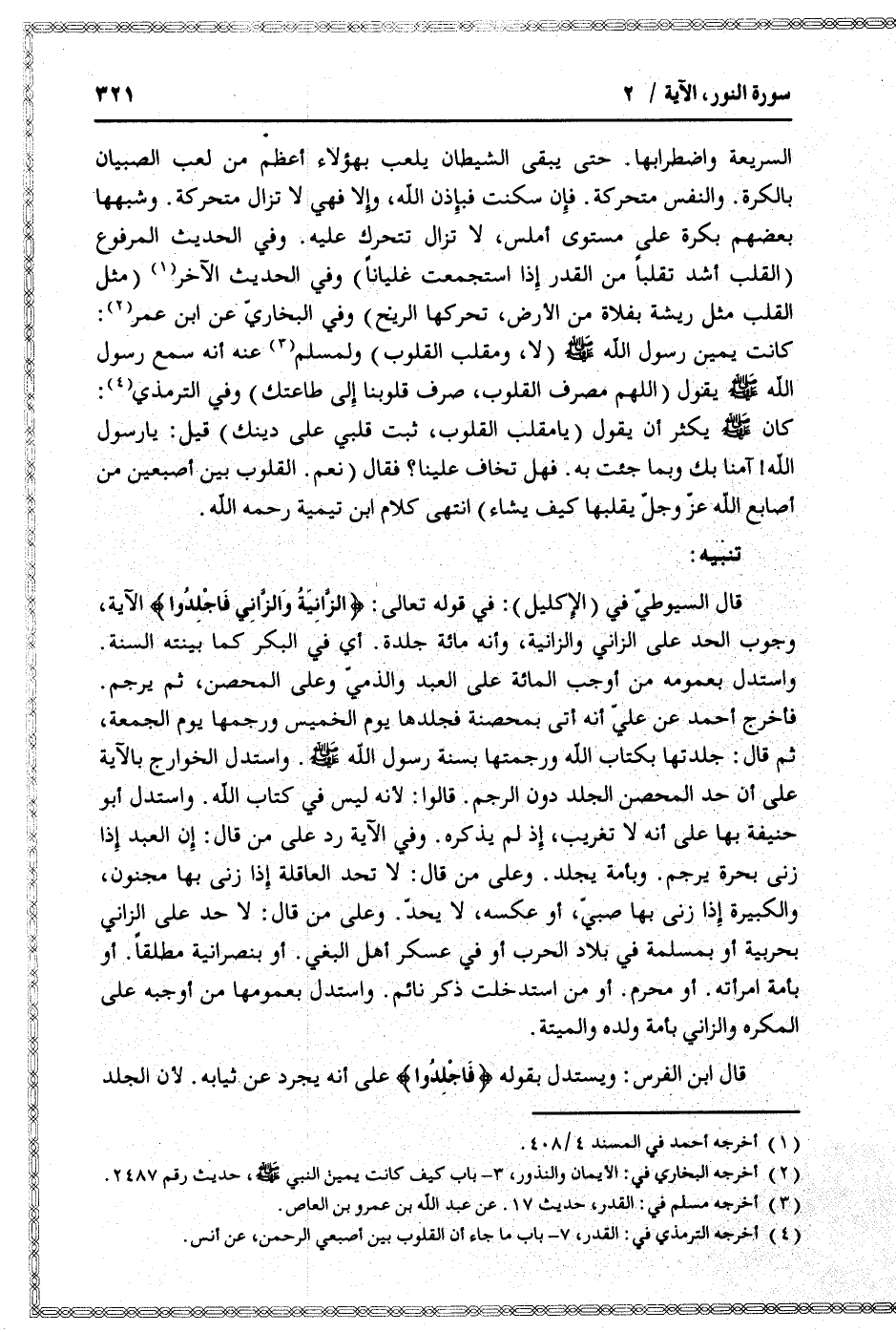 قال السيوطيّ في (الإكليل) : في قوله تعالى: الزَّانِيَةُ وَالزَّانِي فَاجْلِدُوا الآية، وجوب الحد على الزاني والزانية، وأنه مائة جلدة. أي في البكر كما بينته السنة.