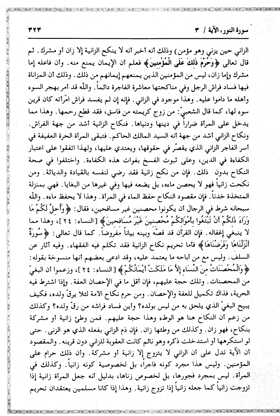 وذلك أنه أخبر أنه لا ينكح الزانية إلا زان أو مشرك. ثم قال تعالى وَحُرِّمَ ذلِكَ عَلَى الْمُؤْمِنِينَ فعلم أن الإيمان يمنع منه. وأن فاعله إما مشرك وإما زان، ليس من المؤمنين الذين يمنعهم إيمانهم من ذلك. وذلك أن المزاناة فيها فساد فراش الرجل وفي مناكحتها معاشرة الفاجرة دائما. والله قد أمر بهجر السوء وأهله ما داموا عليه. وهذا موجود في الزاني. فإنه إن لم يفسد فراش امرأته كان قرين سوء لها، كما قال الشعبيّ: من زوج كريمته من فاسق، فقد قطع رحمها. وهذا مما يدخل على المرأة ضرارا في دينها ودنياها. فنكاح الزانية أشد من جهة الفراش.