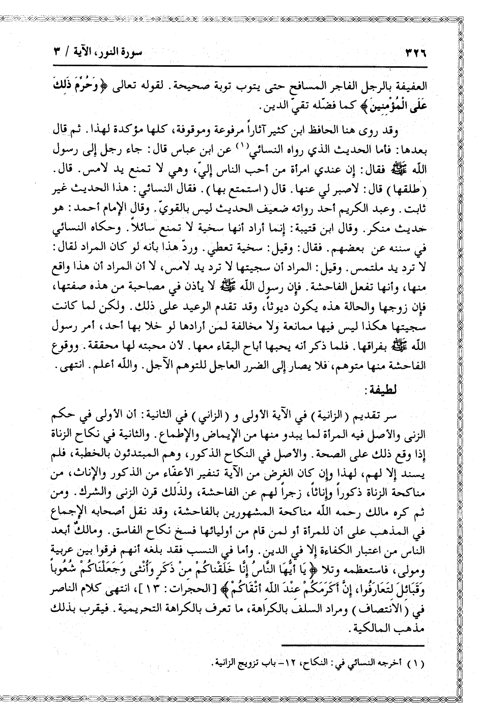 سر تقديم (الزانية) في الآية الأولى و (الزاني) في الثانية: أن الأولى في حكم الزنى والأصل فيه المرأة لما يبدو منها من الإيماض والإطماع. والثانية في نكاح الزناة إذا وقع ذلك على الصحة. والأصل في النكاح الذكور، وهم المبتدئون بالخطبة، فلم يسند إلا لهم، لهذا وإن كان الغرض من الآية تنفير الأعفّاء من الذكور والإناث، من مناكحة الزناة ذكورا وإناثا، زجرا لهم عن الفاحشة، ولذلك قرن الزنى والشرك. ومن ثم كره مالك رحمه الله مناكحة المشهورين بالفاحشة، وقد نقل أصحابه الإجماع في المذهب على أن للمرأة أو لمن قام من أوليائها فسخ نكاح الفاسق. ومالك أبعد الناس من اعتبار الكفاءة إلا في الدين. وأما في النسب فقد بلغه أنهم فرقوا بين عربية ومولى، فاستعظمه وتلا يا أَيُّهَا النَّاسُ إِنَّا خَلَقْناكُمْ مِنْ ذَكَرٍ وَأُنْثى وَجَعَلْناكُمْ شُعُوباً وَقَبائِلَ لِتَعارَفُوا، إِنَّ أَكْرَمَكُمْ عِنْدَ اللَّهِ أَتْقاكُمْ [الحجرات: 13] ، انتهى كلام الناصر في (الانتصاف) ومراد السلف بالكراهة، ما تعرف بالكراهة التحريمية. فيقرب بذلك مذهب المالكية.
