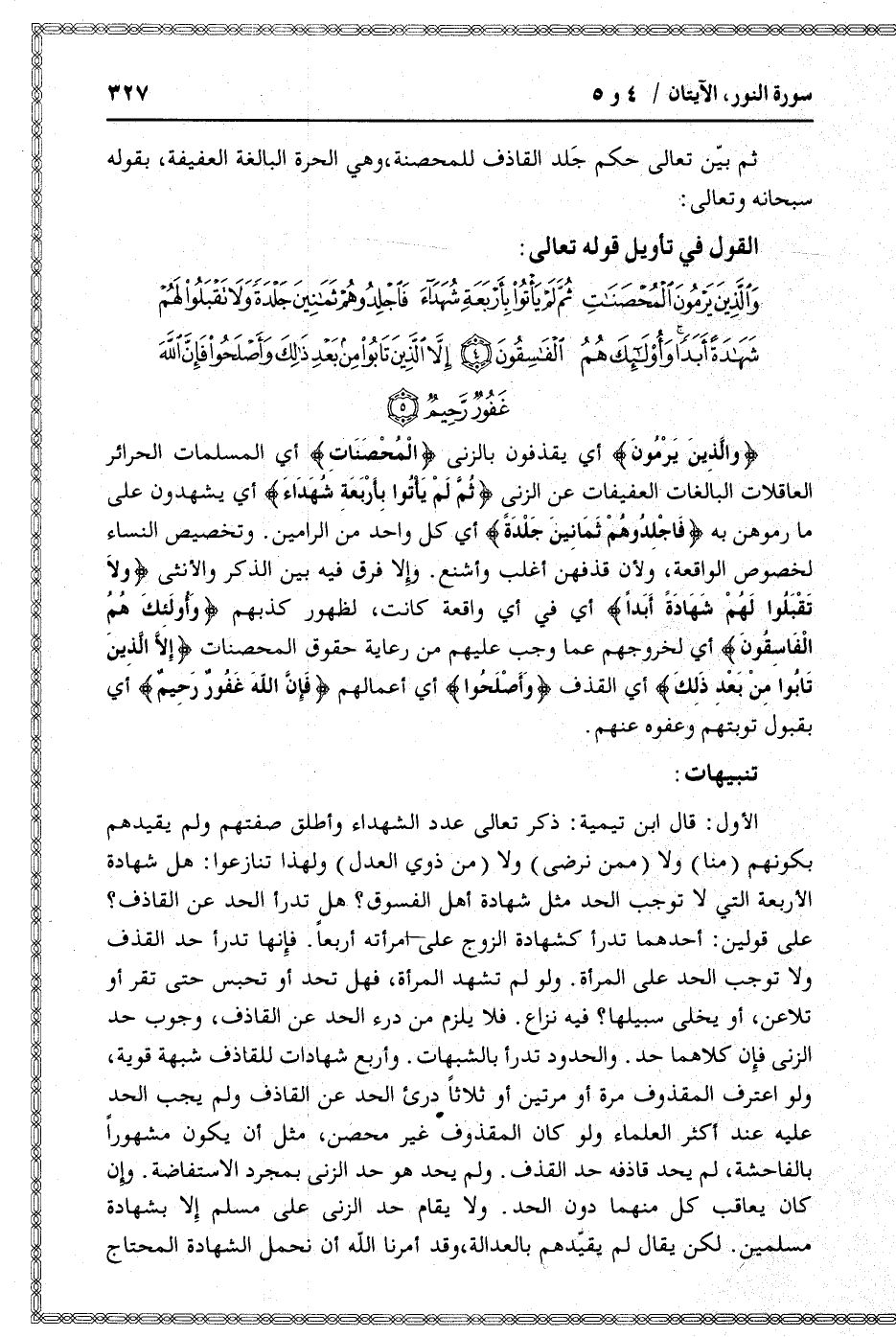 وَالَّذِينَ يَرْمُونَ الْمُحْصَناتِ ثُمَّ لَمْ يَأْتُوا بِأَرْبَعَةِ شُهَداءَ فَاجْلِدُوهُمْ ثَمانِينَ جَلْدَةً وَلا تَقْبَلُوا لَهُمْ شَهادَةً أَبَداً وَأُولئِكَ هُمُ الْفاسِقُونَ (4) إِلاَّ الَّذِينَ تابُوا مِنْ بَعْدِ ذلِكَ وَأَصْلَحُوا فَإِنَّ اللَّهَ غَفُورٌ رَحِيمٌ (5)