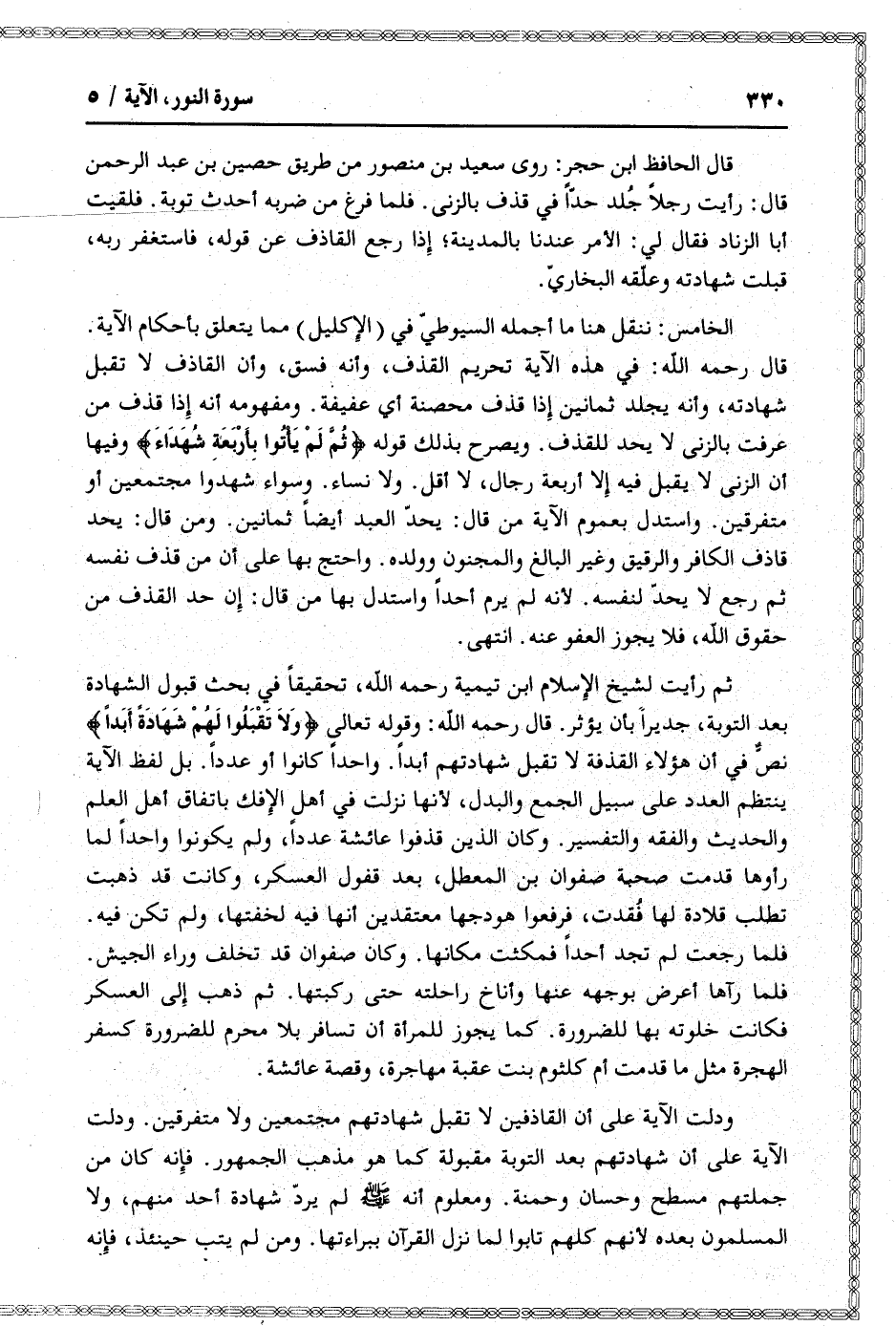 ثم رأيت لشيخ الإسلام ابن تيمية رحمه الله، تحقيقا في بحث قبول الشهادة بعد التوبة، جديرا بأن يؤثر. قال رحمه الله: وقوله تعالى وَلا تَقْبَلُوا لَهُمْ شَهادَةً أَبَداً نصّ في أن هؤلاء القذفة لا تقبل شهادتهم أبدا. واحدا كانوا أو عددا. بل لفظ الآية ينتظم العدد على سبيل الجمع والبدل، لأنها نزلت في أهل الإفك باتفاق أهل العلم والحديث والفقه والتفسير. وكان الذين قذفوا عائشة عددا، ولم يكونوا واحدا لما رأوها قدمت صحبة صفوان بن المعطل، بعد قفول العسكر، وكانت قد ذهبت تطلب قلادة لها فقدت، فرفعوا هودجها معتقدين أنها فيه لخفتها، ولم تكن فيه.