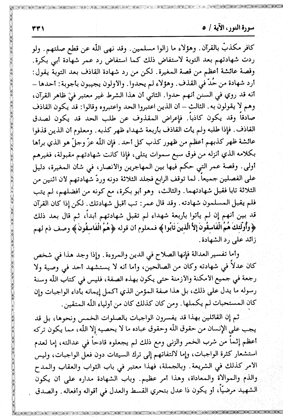 أرد شهادة من حدّ في القذف. وهؤلاء لم يحدوا. والأولون يجيبون بأجوبة: أحدها- أنه قد روي في السنن أنهم حدوا. الثاني أن هذا الشرط غير معتبر في ظاهر القرآن، وهم لا يقولون به. الثالث- أن الذين اعتبروا الحد واعتبروه وقالوا: قد يكون القاذف صادقا وقد يكون كاذبا. فإعراض المقذوف عن طلب الحد قد يكون لصدق القاذف. فإذا طلبه ولم يأت القاذف بأربعة شهداء ظهر كذبه. ومعلوم أن الذين قذفوا عائشة ظهر كذبهم أعظم من ظهور كذب كل أحد. فإن الله عزّ وجلّ هو الذي برأها بكلامه الذي أنزله من فوق سبع سموات يتلى، فإذا كانت شهادتهم مقبولة، فغيرهم أولى. وقصة عمر التي حكم فيها بين المهاجرين والأنصار، في شأن المغيرة، دليل على الفصلين جميعا. لما توقف الرابع فجلد الثلاثة دونه وردّ شهادتهم لأن اثنين من الثلاثة تابا فقبل شهادتهما. والثالث، وهو أبو بكرة، مع كونه من أفضلهم، لم يتب فلم يقبل المسلمون شهادته. وقد قال عمر: تب أقبل شهادتك. لكن إذا كان القرآن قد بين أنهم إن لم يأتوا بأربعة شهداء لم تقبل شهادتهم أبدا، ثم قال بعد ذلك وَأُولئِكَ هُمُ الْفاسِقُونَ إِلَّا الَّذِينَ تابُوا فمعلوم أن قوله هُمُ الْفاسِقُونَ وصف ذم لهم زائد على رد الشهادة.