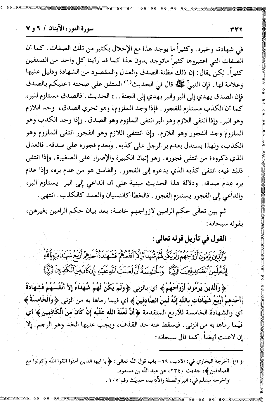 وَالَّذِينَ يَرْمُونَ أَزْواجَهُمْ وَلَمْ يَكُنْ لَهُمْ شُهَداءُ إِلاَّ أَنْفُسُهُمْ فَشَهادَةُ أَحَدِهِمْ أَرْبَعُ شَهاداتٍ بِاللَّهِ إِنَّهُ لَمِنَ الصَّادِقِينَ (6) وَالْخامِسَةُ أَنَّ لَعْنَتَ اللَّهِ عَلَيْهِ إِنْ كانَ مِنَ الْكاذِبِينَ (7)