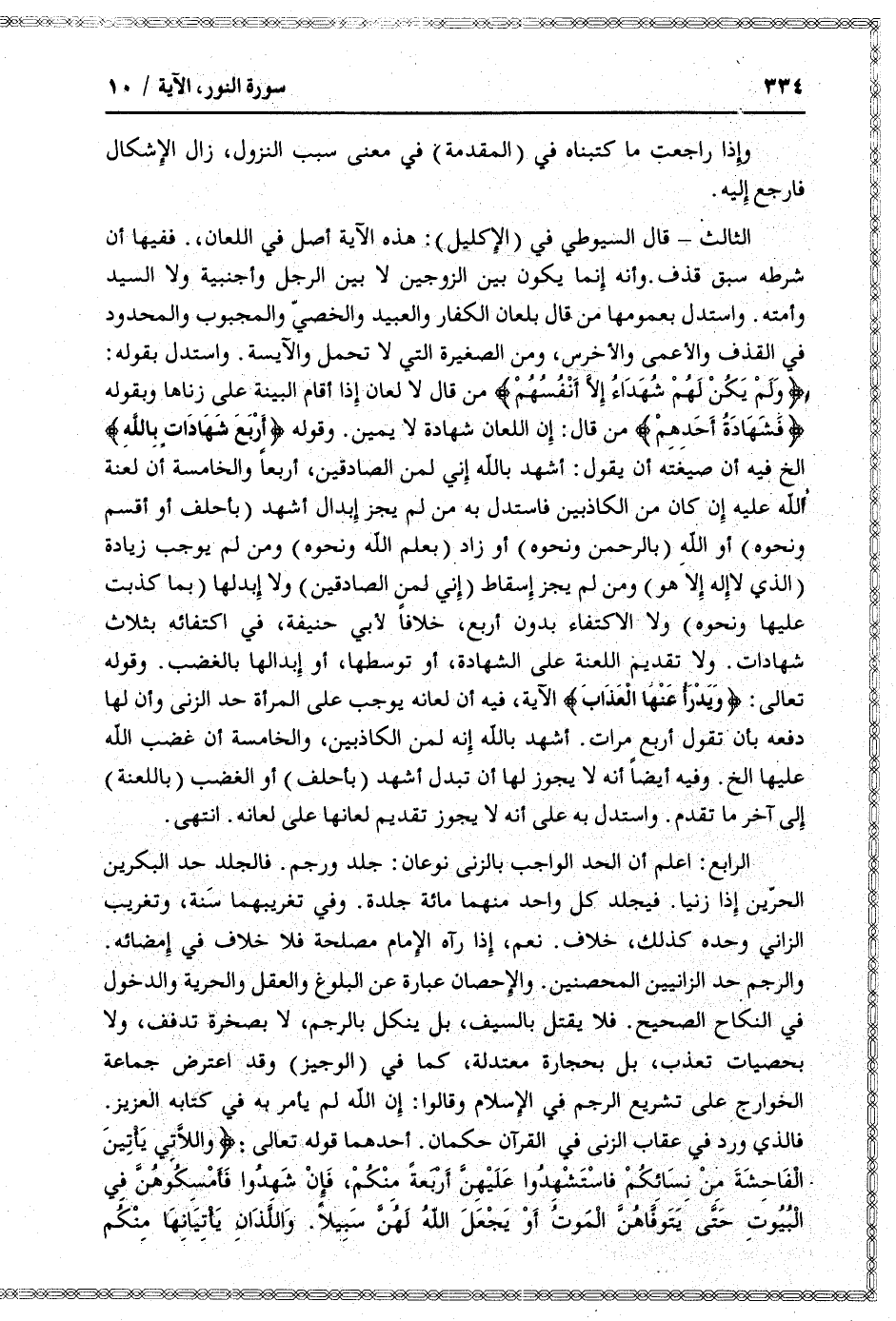 الثالث- قال السيوطي في (الإكليل) : هذه الآية أصل في اللعان،. ففيها أن شرطه سبق قذف. وأنه إنما يكون بين الزوجين لا بين الرجل وأجنبية ولا السيد وأمته. واستدل بعمومها من قال بلعان الكفار والعبيد والخصيّ والمجبوب والمحدود في القذف والأعمى والأخرس، ومن الصغيرة التي لا تحمل والآيسة. واستدل بقوله: