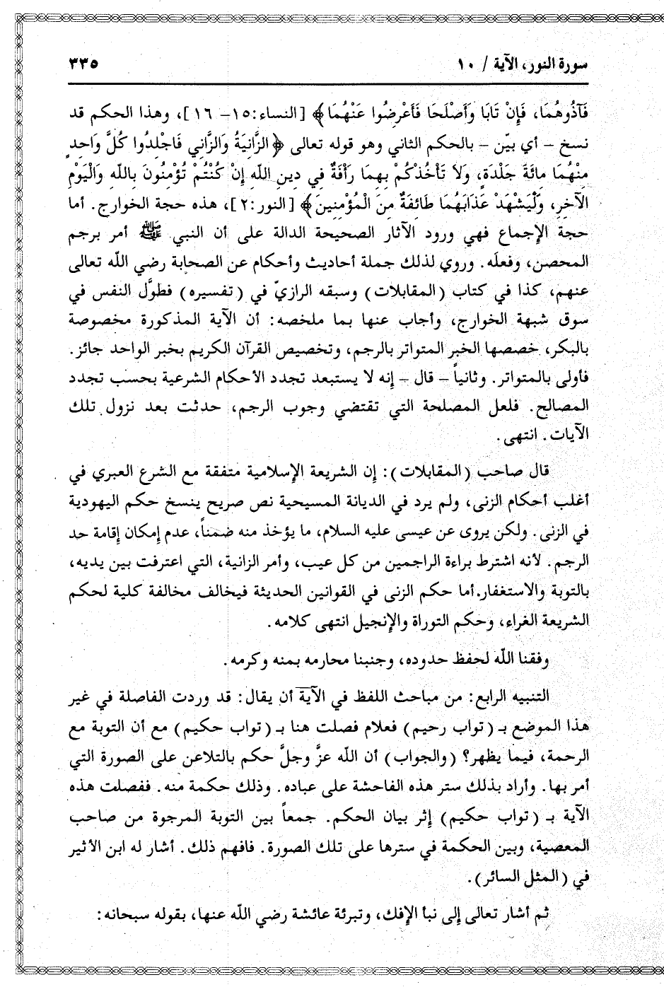 [النساء: 15- 16] ، وهذا الحكم قد نسخ- أي بيّن- بالحكم الثاني وهو قوله تعالى الزَّانِيَةُ وَالزَّانِي فَاجْلِدُوا كُلَّ واحِدٍ مِنْهُما مِائَةَ جَلْدَةٍ، وَلا تَأْخُذْكُمْ بِهِما رَأْفَةٌ فِي دِينِ اللَّهِ إِنْ كُنْتُمْ تُؤْمِنُونَ بِاللَّهِ وَالْيَوْمِ الْآخِرِ، وَلْيَشْهَدْ عَذابَهُما طائِفَةٌ مِنَ الْمُؤْمِنِينَ [النور: 2] ، هذه حجة الخوارج. أما حجة الإجماع فهي ورود الآثار الصحيحة الدالة على أن النبي صلى الله عليه وسلم أمر برجم المحصن، وفعله. وروي لذلك جملة أحاديث وأحكام عن الصحابة رضي الله تعالى عنهم، كذا في كتاب (المقابلات) وسبقه الرازيّ في (تفسيره) فطوّل النفس في سوق شبهة الخوارج، وأجاب عنها بما ملخصه: أن الآية المذكورة مخصوصة بالبكر، خصصها الخبر المتواتر بالرجم، وتخصيص القرآن الكريم بخبر الواحد جائز.