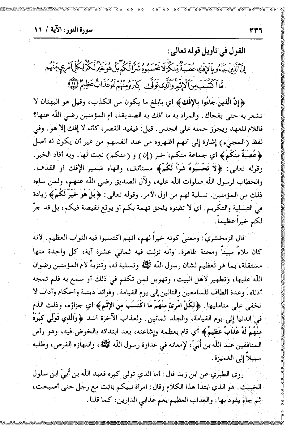 إِنَّ الَّذِينَ جاؤُ بِالْإِفْكِ عُصْبَةٌ مِنْكُمْ لا تَحْسَبُوهُ شَرًّا لَكُمْ بَلْ هُوَ خَيْرٌ لَكُمْ لِكُلِّ امْرِئٍ مِنْهُمْ مَا اكْتَسَبَ مِنَ الْإِثْمِ وَالَّذِي تَوَلَّى كِبْرَهُ مِنْهُمْ لَهُ عَذابٌ عَظِيمٌ (11)
