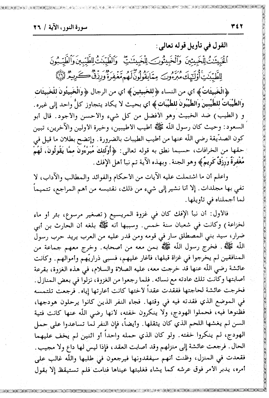و (الطيب) ضد الخبيث وهو الأفضل من كل شيء والأحسن والأجود. قال أبو السعود: وحيث كان رسول الله صلى الله عليه وسلم أطيب الأطيبين، وخيرة الأولين والآخرين، تبين كون الصدّيقة رضي الله عنها من أطيب الطيبات بالضرورة. واتضح بطلان ما قيل في حقها من الخرافات، حسبما نطق به قوله تعالى: أُولئِكَ مُبَرَّؤُنَ مِمَّا يَقُولُونَ، لَهُمْ مَغْفِرَةٌ وَرِزْقٌ كَرِيمٌ وهو الجنة. وبهذه الآية تم نبأ أهل الإفك.