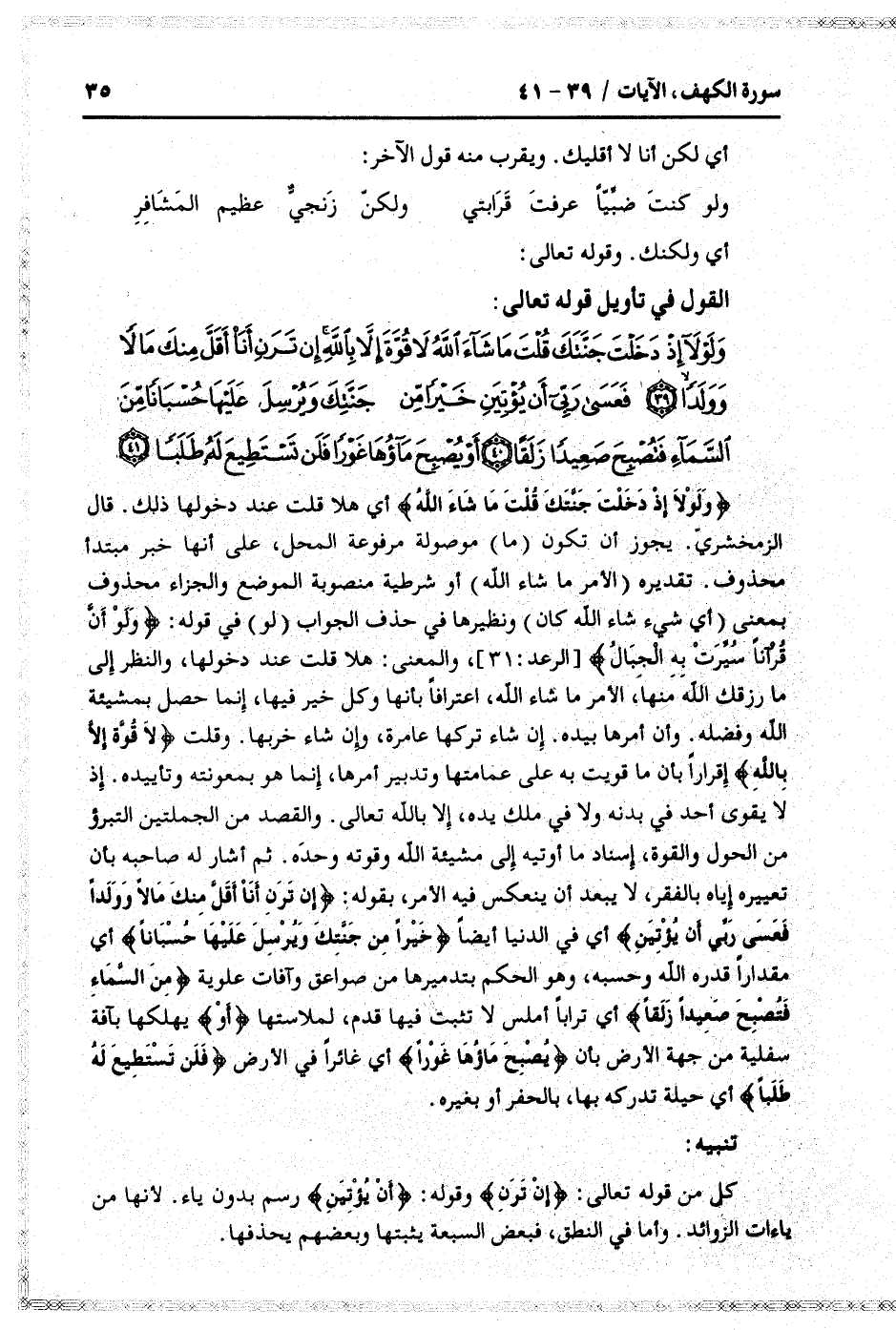 وَلَوْلا إِذْ دَخَلْتَ جَنَّتَكَ قُلْتَ ما شاءَ اللَّهُ لا قُوَّةَ إِلاَّ بِاللَّهِ إِنْ تَرَنِ أَنَا أَقَلَّ مِنْكَ مالاً وَوَلَداً (39) فَعَسى رَبِّي أَنْ يُؤْتِيَنِ خَيْراً مِنْ جَنَّتِكَ وَيُرْسِلَ عَلَيْها حُسْباناً مِنَ السَّماءِ فَتُصْبِحَ صَعِيداً زَلَقاً (40) أَوْ يُصْبِحَ ماؤُها غَوْراً فَلَنْ تَسْتَطِيعَ لَهُ طَلَباً (41)
