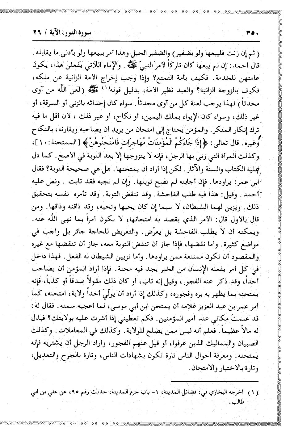 فهذا يوجب لعنة كل من آوى محدثا. سواء كان إحداثه بالزنى أو السرقة، أو غير ذلك، وسواء كان الإيواء بملك اليمين، أو نكاح، أو غير ذلك، لأن أقل ما فيه ترك إنكار المنكر. والمؤمن يحتاج إلى امتحان من يريد أن يصاحبه ويقارنه، بالنكاح وغيره. قال تعالى: إِذا جاءَكُمُ الْمُؤْمِناتُ مُهاجِراتٍ فَامْتَحِنُوهُنَّ [الممتحنة: 10] ، وكذلك المرأة التي زنى بها الرجل، فإنه لا يتزوجها إلا بعد التوبة في الأصح. كما دل عليه الكتاب والسنة والآثار. لكن إذا أراد أن يمتحنها. هل هي صحيحة التوبة؟ فقال ابن عمر: يراودها. فإن أجابته لم تصح توبتها. وإن لم تجبه فقد تابت. ونص عليه أحمد. وقيل: هذا فيه طلب الفاحشة. وقد تنقض التوبة. وقد تأمره نفسه بتحقيق ذلك. ويزين لهما الشيطان، لا سيما إن كان يحبها وتحبه، وقد ذاقته وذاقها. ومن قال بالأول قال: الأمر الذي يقصد به امتحانها، لا يكون أمرا بما نهى الله عنه.