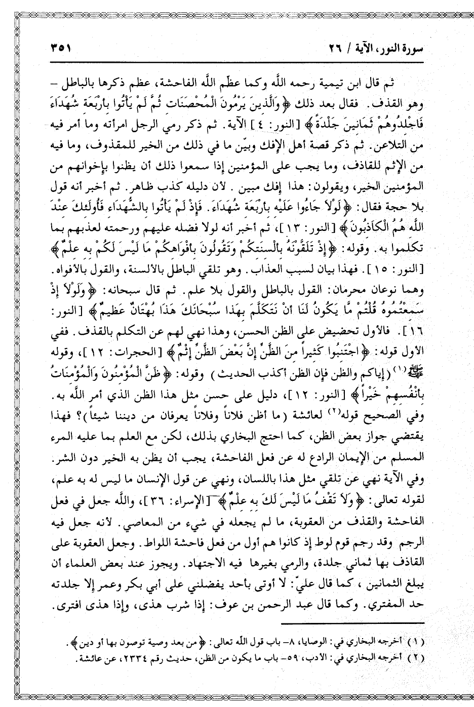 ثم قال ابن تيمية رحمه الله وكما عظّم الله الفاحشة، عظم ذكرها بالباطل- وهو القذف. فقال بعد ذلك وَالَّذِينَ يَرْمُونَ الْمُحْصَناتِ ثُمَّ لَمْ يَأْتُوا بِأَرْبَعَةِ شُهَداءَ فَاجْلِدُوهُمْ ثَمانِينَ جَلْدَةً [النور: 4] الآية. ثم ذكر رمي الرجل امرأته وما أمر فيه من التلاعن. ثم ذكر قصة أهل الإفك وبيّن ما في ذلك من الخير للمقذوف، وما فيه من الإثم للقاذف، وما يجب على المؤمنين إذا سمعوا ذلك أن يظنوا بإخوانهم من المؤمنين الخير، ويقولون: هذا إفك مبين. لأن دليله كذب ظاهر. ثم أخبر أنه قول بلا حجة فقال: لَوْلا جاؤُ عَلَيْهِ بِأَرْبَعَةِ شُهَداءَ. فَإِذْ لَمْ يَأْتُوا بِالشُّهَداءِ فَأُولئِكَ عِنْدَ اللَّهِ هُمُ الْكاذِبُونَ [النور: 13] ، ثم أخبر أنه لولا فضله عليهم ورحمته لعذبهم بما تكلموا به. وقوله: إِذْ تَلَقَّوْنَهُ بِأَلْسِنَتِكُمْ وَتَقُولُونَ بِأَفْواهِكُمْ ما لَيْسَ لَكُمْ بِهِ عِلْمٌ [النور: 15] . فهذا بيان لسبب العذاب. وهو تلقي الباطل بالألسنة، والقول بالأفواه.