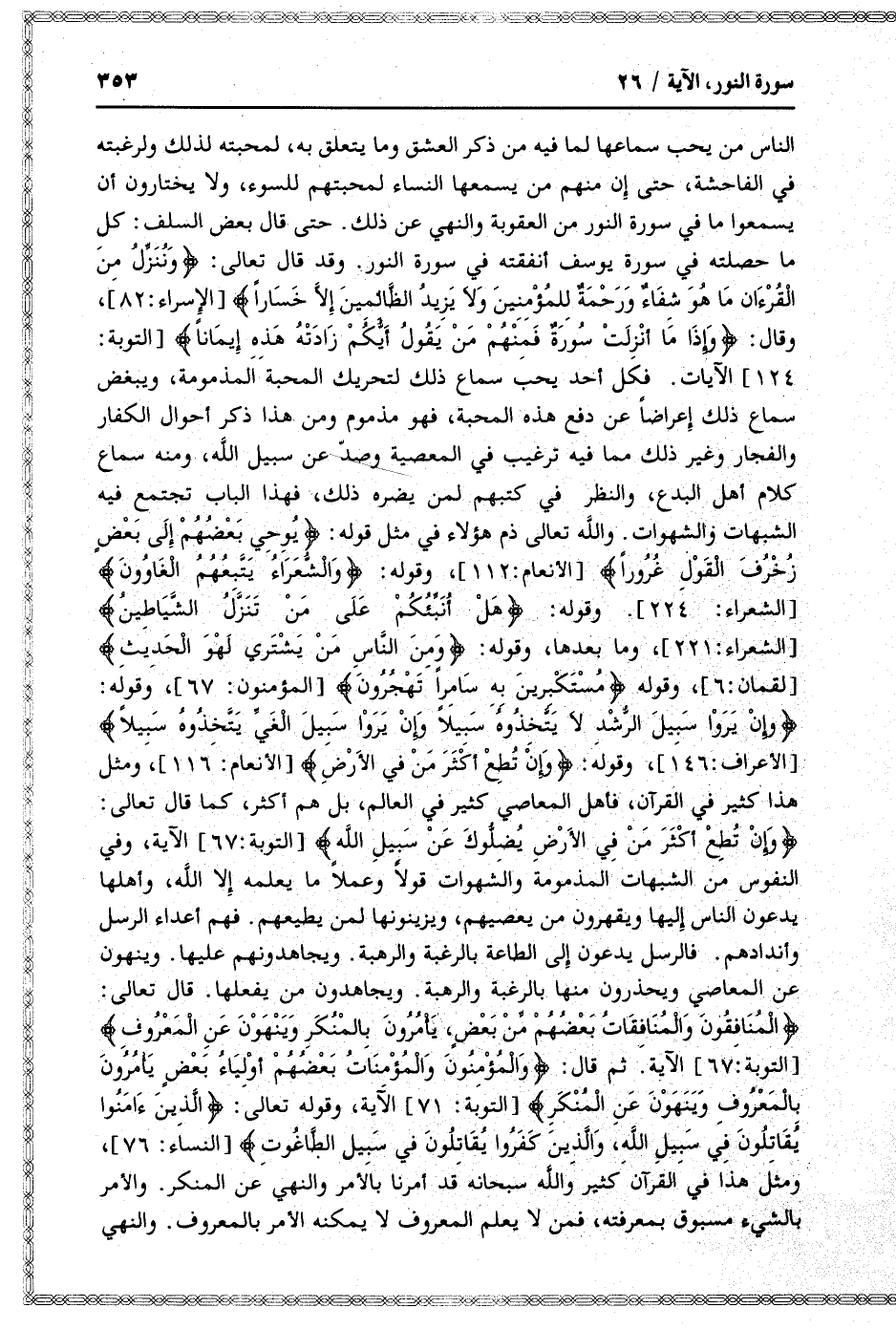 124] الآيات. فكل أحد يحب سماع ذلك لتحريك المحبة المذمومة، ويبغض سماع ذلك إعراضا عن دفع هذه المحبة، فهو مذموم ومن هذا ذكر أحوال الكفار والفجار وغير ذلك مما فيه ترغيب في المعصية وصدّ عن سبيل الله، ومنه سماع كلام أهل البدع، والنظر في كتبهم لمن يضره ذلك، فهذا الباب تجتمع فيه الشبهات والشهوات. والله تعالى ذم هؤلاء في مثل قوله: يُوحِي بَعْضُهُمْ إِلى بَعْضٍ زُخْرُفَ الْقَوْلِ غُرُوراً [الأنعام: 112] ، وقوله: وَالشُّعَراءُ يَتَّبِعُهُمُ الْغاوُونَ [الشعراء: 224] . وقوله: هَلْ أُنَبِّئُكُمْ عَلى مَنْ تَنَزَّلُ الشَّياطِينُ [الشعراء: 221] ، وما بعدها، وقوله: وَمِنَ النَّاسِ مَنْ يَشْتَرِي لَهْوَ الْحَدِيثِ [لقمان: 6] ، وقوله مُسْتَكْبِرِينَ بِهِ سامِراً تَهْجُرُونَ [المؤمنون: 67] ، وقوله: