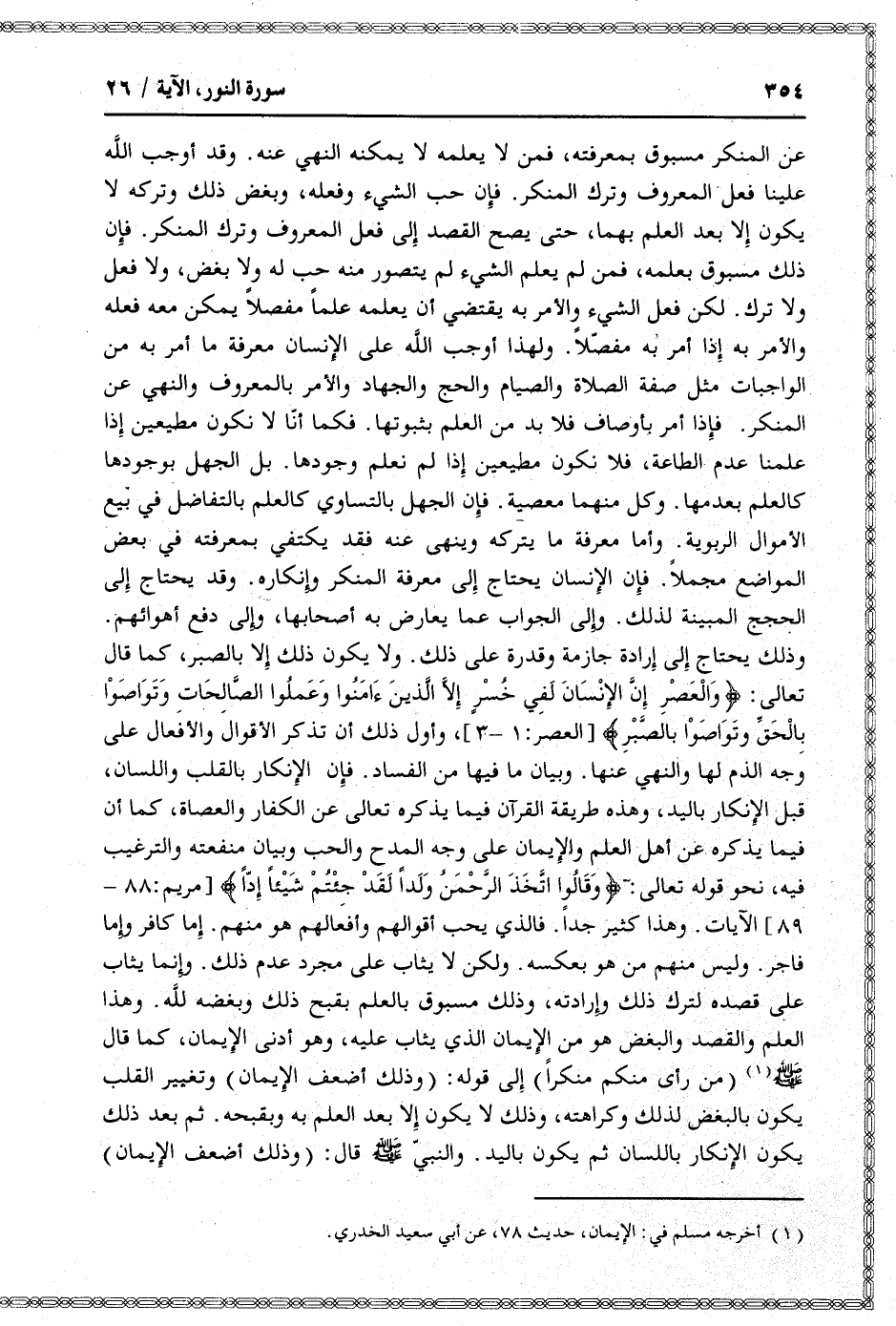 وذلك يحتاج إلى إرادة جازمة وقدرة على ذلك. ولا يكون ذلك إلا بالصبر، كما قال تعالى: وَالْعَصْرِ إِنَّ الْإِنْسانَ لَفِي خُسْرٍ إِلَّا الَّذِينَ آمَنُوا وَعَمِلُوا الصَّالِحاتِ وَتَواصَوْا بِالْحَقِّ وَتَواصَوْا بِالصَّبْرِ [العصر: 1- 3] ، وأول ذلك أن تذكر الأقوال والأفعال على وجه الذم لها والنهي عنها. وبيان ما فيها من الفساد. فإن الإنكار بالقلب واللسان، قبل الإنكار باليد، وهذه طريقة القرآن فيما يذكره تعالى عن الكفار والعصاة، كما أن فيما يذكره عن أهل العلم والإيمان على وجه المدح والحب وبيان منفعته والترغيب فيه، نحو قوله تعالى: وَقالُوا اتَّخَذَ الرَّحْمنُ وَلَداً لَقَدْ جِئْتُمْ شَيْئاً إِدًّا [مريم: 88- 89] الآيات. وهذا كثير جدا. فالذي يحب أقوالهم وأفعالهم هو منهم. إما كافر وإما فاجر. وليس منهم من هو بعكسه. ولكن لا يثاب على مجرد عدم ذلك. وإنما يثاب على قصده لترك ذلك وإرادته، وذلك مسبوق بالعلم بقبح ذلك وبغضه لله. وهذا العلم والقصد والبغض هو من الإيمان الذي يثاب عليه، وهو أدنى الإيمان، كما