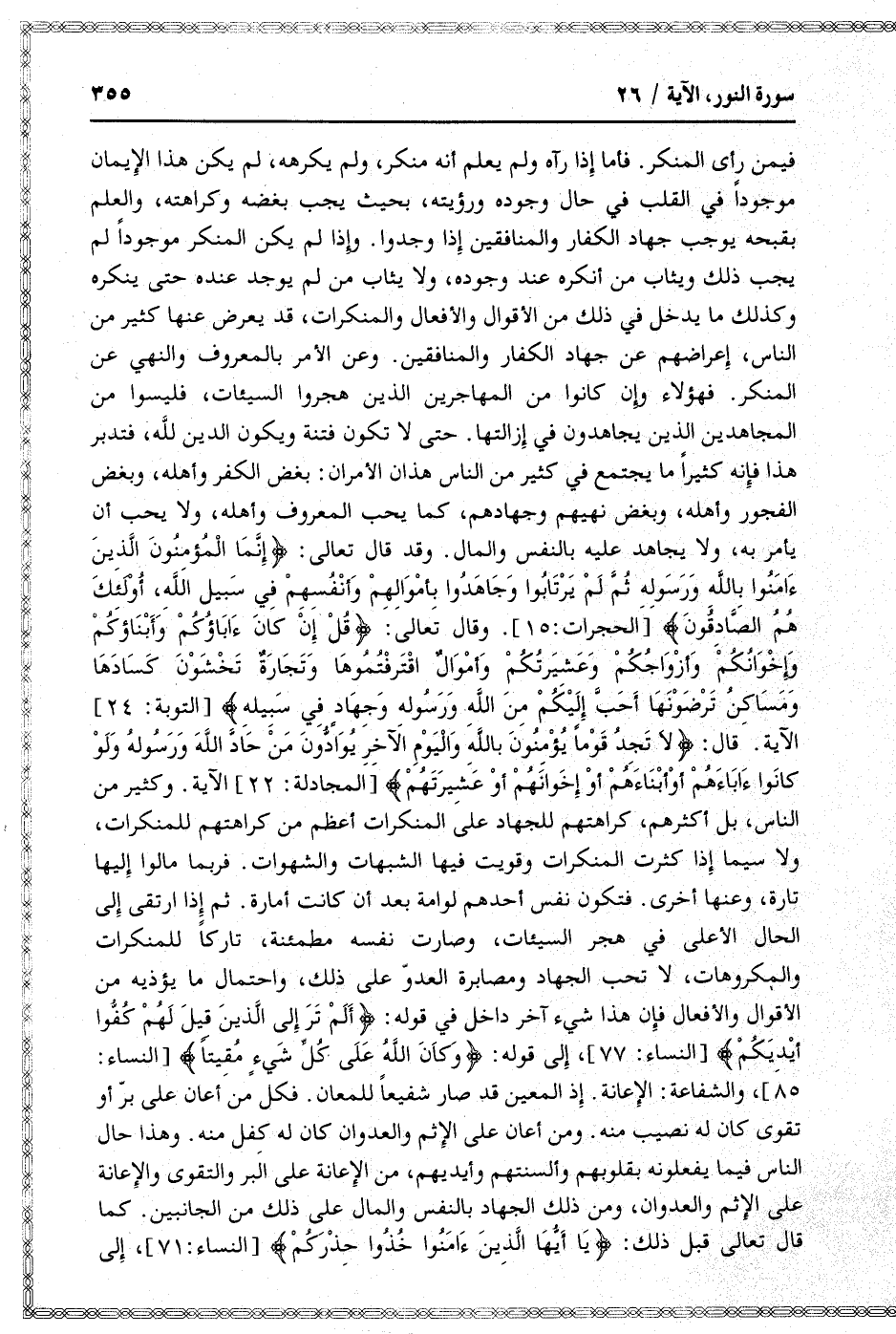 فيمن رأى المنكر. فأما إذا رآه ولم يعلم أنه منكر، ولم يكرهه، لم يكن هذا الإيمان موجودا في القلب في حال وجوده ورؤيته، بحيث يجب بغضه وكراهته، والعلم بقبحه يوجب جهاد الكفار والمنافقين إذا وجدوا. وإذا لم يكن المنكر موجودا لم يجب ذلك ويثاب من أنكره عند وجوده، ولا يثاب من لم يوجد عنده حتى ينكره وكذلك ما يدخل في ذلك من الأقوال والأفعال والمنكرات، قد يعرض عنها كثير من الناس، إعراضهم عن جهاد الكفار والمنافقين. وعن الأمر بالمعروف والنهي عن المنكر. فهؤلاء وإن كانوا من المهاجرين الذين هجروا السيئات، فليسوا من المجاهدين الذين يجاهدون في إزالتها. حتى لا تكون فتنة ويكون الدين لله، فتدبر هذا فإنه كثيرا ما يجتمع في كثير من الناس هذان الأمران: بغض الكفر وأهله، وبغض الفجور وأهله، وبغض نهيهم وجهادهم، كما يحب المعروف وأهله، ولا يحب أن يأمر به، ولا يجاهد عليه بالنفس والمال. وقد قال تعالى: إِنَّمَا الْمُؤْمِنُونَ الَّذِينَ آمَنُوا بِاللَّهِ وَرَسُولِهِ ثُمَّ لَمْ يَرْتابُوا وَجاهَدُوا بِأَمْوالِهِمْ وَأَنْفُسِهِمْ فِي سَبِيلِ اللَّهِ، أُولئِكَ هُمُ الصَّادِقُونَ [الحجرات: 15] . وقال تعالى: قُلْ إِنْ كانَ آباؤُكُمْ وَأَبْناؤُكُمْ وَإِخْوانُكُمْ وَأَزْواجُكُمْ وَعَشِيرَتُكُمْ وَأَمْوالٌ اقْتَرَفْتُمُوها وَتِجارَةٌ تَخْشَوْنَ كَسادَها وَمَساكِنُ تَرْضَوْنَها أَحَبَّ إِلَيْكُمْ مِنَ اللَّهِ وَرَسُولِهِ وَجِهادٍ فِي سَبِيلِهِ [التوبة: 24] الآية. قال: لا تَجِدُ قَوْماً يُؤْمِنُونَ بِاللَّهِ وَالْيَوْمِ الْآخِرِ يُوادُّونَ مَنْ حَادَّ اللَّهَ وَرَسُولَهُ وَلَوْ كانُوا آباءَهُمْ أَوْ أَبْناءَهُمْ أَوْ إِخْوانَهُمْ أَوْ عَشِيرَتَهُمْ [المجادلة: 22] الآية. وكثير من الناس، بل أكثرهم، كراهتهم للجهاد على المنكرات أعظم من كراهتهم للمنكرات، ولا سيما إذا كثرت المنكرات وقويت فيها الشبهات والشهوات. فربما مالوا إليها تارة، وعنها أخرى. فتكون نفس أحدهم لوامة بعد أن كانت أمارة. ثم إذا ارتقى إلى الحال الأعلى في هجر السيئات، وصارت نفسه مطمئنة، تاركا للمنكرات والمكروهات، لا تحب الجهاد ومصابرة العدوّ على ذلك، واحتمال ما يؤذيه من الأقوال والأفعال فإن هذا شيء آخر داخل في قوله: أَلَمْ تَرَ إِلَى الَّذِينَ قِيلَ لَهُمْ كُفُّوا أَيْدِيَكُمْ [النساء: 77] ، إلى قوله: وَكانَ اللَّهُ عَلى كُلِّ شَيْءٍ مُقِيتاً [النساء: