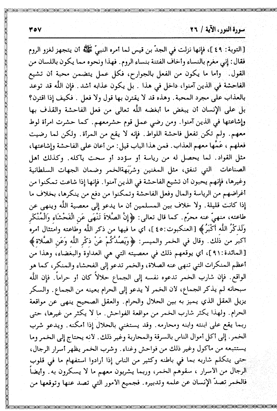بل على الإنسان أن يبغض ما أبغضه الله تعالى من فعل الفاحشة والقذف بها وإشاعتها في الذين آمنوا. ومن رضي عمل قوم حشر معهم. كما حشرت امرأة لوط معهم. ولم تكن تفعل فاحشة اللواط. فإنه لا يقع من المرأة. ولكن لما رضيت فعلهم، عمّها معهم العذاب. فمن هذا الباب قيل: من أعان على الفاحشة وإشاعتها، مثل القواد. لما يحصل له من رئاسة أو سؤدد أو سحت يأكله. وكذلك أهل الصناعات التي تنفق، مثل المغنين وشربة الخمر وضمان الجهات السلطانية وغيرها، فإنهم يحبون أن تشيع الفاحشة في الذين آمنوا. فإنها إذا شاعت تمكنوا من أغراضهم من الرياسة والمال وفعل الفاحشة وتمكنوا من دفع من ينكرها، بخلاف ما إذا كانت قليلة. ولا خلاف بين المسلمين أن ما يدعو إلى معصية الله وينهى عن طاعته، منهيّ عنه محرّم. كما قال تعالى: إِنَّ الصَّلاةَ تَنْهى عَنِ الْفَحْشاءِ وَالْمُنْكَرِ وَلَذِكْرُ اللَّهِ أَكْبَرُ [العنكبوت: 45] ، أي ما فيها من ذكر الله وطاعته وامتثال أمره أكبر من ذلك. وقال في الخمر والميسر: وَيَصُدَّكُمْ عَنْ ذِكْرِ اللَّهِ وَعَنِ الصَّلاةِ [المائدة: 91] ، أي يوقعهم ذلك في معصيته التي هي العداوة والبغضاء، وهذا من أعظم المنكرات التي تنهى عنه الصلاة، والخمر تدعو إلى الفحشاء والمنكر، كما هو الواقع. فإن شارب الخمر تدعوه نفسه إلى الجماع حلالا كان أو حراما. فإن الله سبحانه لم يذكر الجماع، لأن الخمر لا يدعو إلى الحرام بعينه من الجماع. والسكر يزيل العقل الذي يميز به بين الحلال والحرام. والعقل الصحيح ينهى عن مواقعة الحرام. ولهذا يكثر شارب الخمر من مواقعة الفواحش. ما لا يكثر من غيرها، حتى ربما يقع على ابنته وابنه ومحارمه. وقد يستغني بالحلال إذا أمكنه. ويدعو شرب الخمر. إلى أكل أموال الناس بالسرقة والمحاربة وغير ذلك. لأنه يحتاج إلى الخمر وما يستتبعه من مأكول وغير ذلك من فواحش وغناء. وشرب الخمر يظهر أسرار الرجال، حتى يتكلم شاربه بما في باطنه وكثير من الناس إذا أرادوا استفهام ما في قلوب الرجال من الأسرار، سقوهم الخمر، وربما يشربون معهم ما لا يسكرون به. وأيضا فالخمر تصدّ الإنسان عن علمه وتدبيره. فجميع الأمور التي تصد عنها وتوقعها من