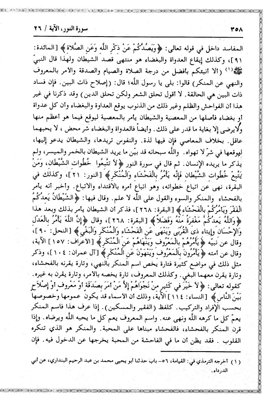 كقوله تعالى: لا خَيْرَ فِي كَثِيرٍ مِنْ نَجْواهُمْ إِلَّا مَنْ أَمَرَ بِصَدَقَةٍ أَوْ مَعْرُوفٍ أَوْ إِصْلاحٍ بَيْنَ النَّاسِ [النساء: 114] الآية، وذلك أن الأسماء قد يكون عمومها وخصوصها بحسب الإفراد والتركيب. كلفظ (الفقير والمسكين) . إذا عرف هذا فاسم المنكر يعمّ كل ما كرهه الله ونهى عنه. واسم المعروف يعم كل ما يحبه الله ويرضاه. وإذا قرن المنكر بالفحشاء، فالفحشاء مبناها على المحبة. والمنكر هو الذي تنكره القلوب. فقد يظن أن ما في الفاحشة من المحبة يخرجها عن الدخول فيه. فإن
