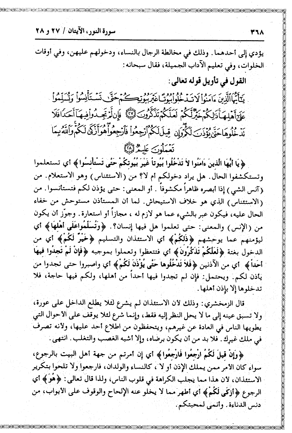 يا أَيُّهَا الَّذِينَ آمَنُوا لا تَدْخُلُوا بُيُوتاً غَيْرَ بُيُوتِكُمْ حَتَّى تَسْتَأْنِسُوا وَتُسَلِّمُوا عَلى أَهْلِها ذلِكُمْ خَيْرٌ لَكُمْ لَعَلَّكُمْ تَذَكَّرُونَ (27) فَإِنْ لَمْ تَجِدُوا فِيها أَحَداً فَلا تَدْخُلُوها حَتَّى يُؤْذَنَ لَكُمْ وَإِنْ قِيلَ لَكُمُ ارْجِعُوا فَارْجِعُوا هُوَ أَزْكى لَكُمْ وَاللَّهُ بِما تَعْمَلُونَ عَلِيمٌ (28)