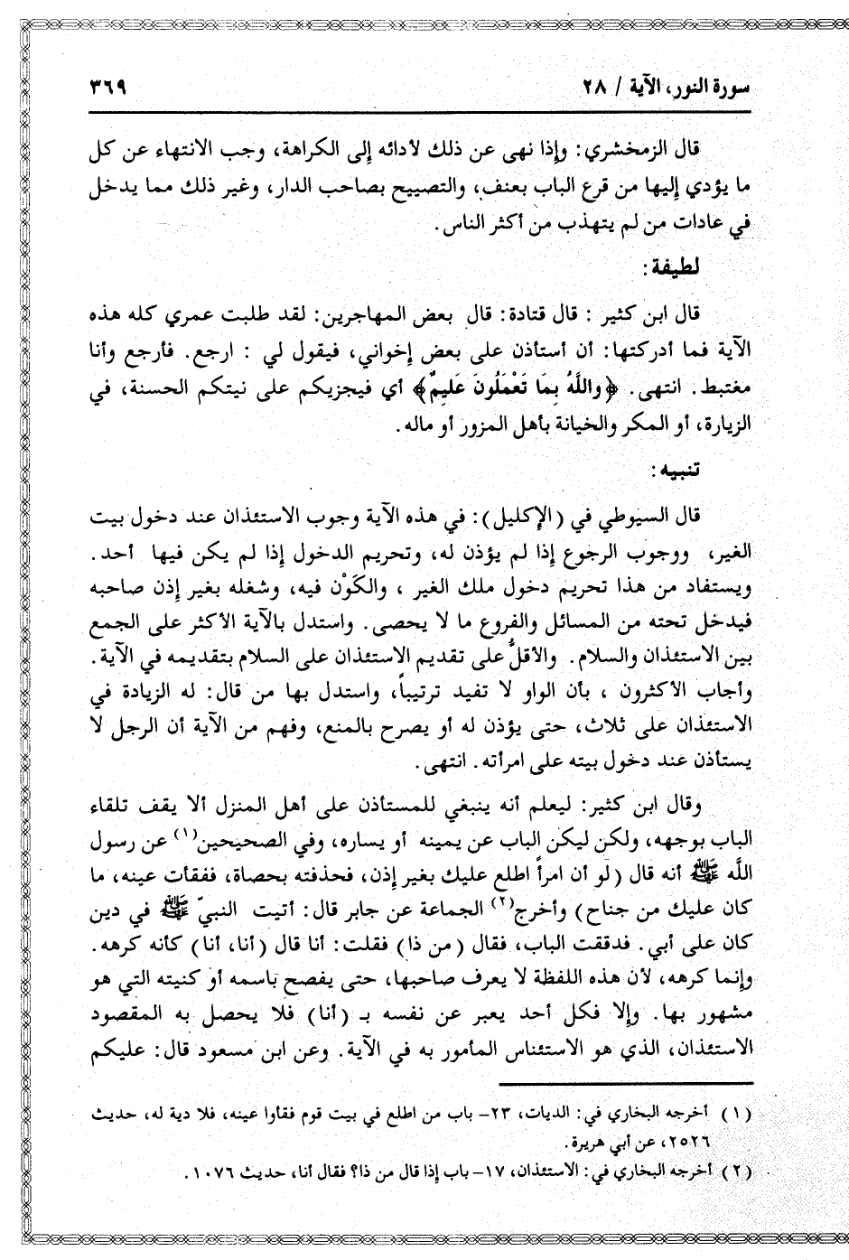 قال السيوطي في (الإكليل) : في هذه الآية وجوب الاستئذان عند دخول بيت الغير، ووجوب الرجوع إذا لم يؤذن له، وتحريم الدخول إذا لم يكن فيها أحد.