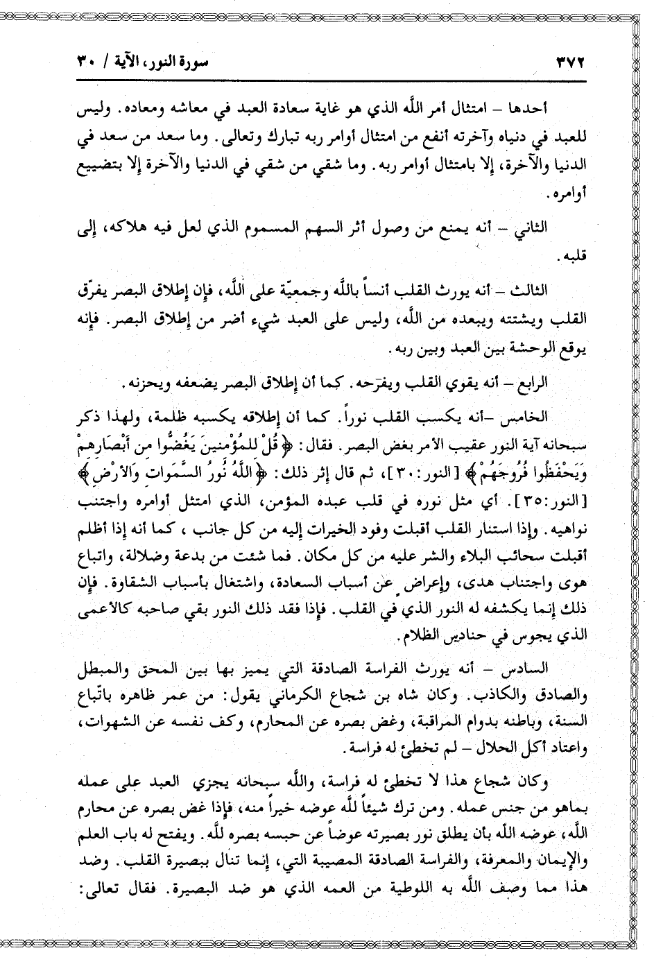 الخامس- أنه يكسب القلب نورا. كما أن إطلاقه يكسبه ظلمة، ولهذا ذكر سبحانه آية النور عقيب الأمر بغض البصر. فقال: قُلْ لِلْمُؤْمِنِينَ يَغُضُّوا مِنْ أَبْصارِهِمْ وَيَحْفَظُوا فُرُوجَهُمْ [النور: 30] ، ثم قال إثر ذلك: اللَّهُ نُورُ السَّماواتِ وَالْأَرْضِ [النور: 35] . أي مثل نوره في قلب عبده المؤمن، الذي امتثل أوامره واجتنب نواهيه. وإذا استنار القلب أقبلت وفود الخيرات إليه من كل جانب، كما أنه إذا أظلم أقبلت سحائب البلاء والشر عليه من كل مكان. فما شئت من بدعة وضلالة، واتباع هوى واجتناب هدى، وإعراض عن أسباب السعادة، واشتغال بأسباب الشقاوة. فإن ذلك إنما يكشفه له النور الذي في القلب. فإذا فقد ذلك النور بقي صاحبه كالأعمى الذي يجوس في حنادس الظلام.