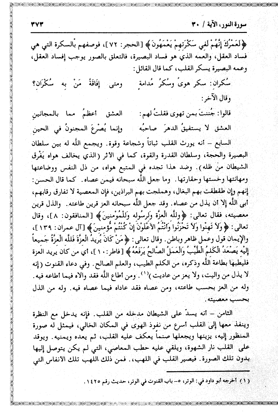 لَعَمْرُكَ إِنَّهُمْ لَفِي سَكْرَتِهِمْ يَعْمَهُونَ [الحجر: 72] ، فوصفهم بالسكرة التي هي فساد العقل، والعمه الذي هو فساد البصيرة، فالتعلق بالصور يوجب إفساد العقل، وعمه البصيرة يسكر القلب، كما قال القائل: