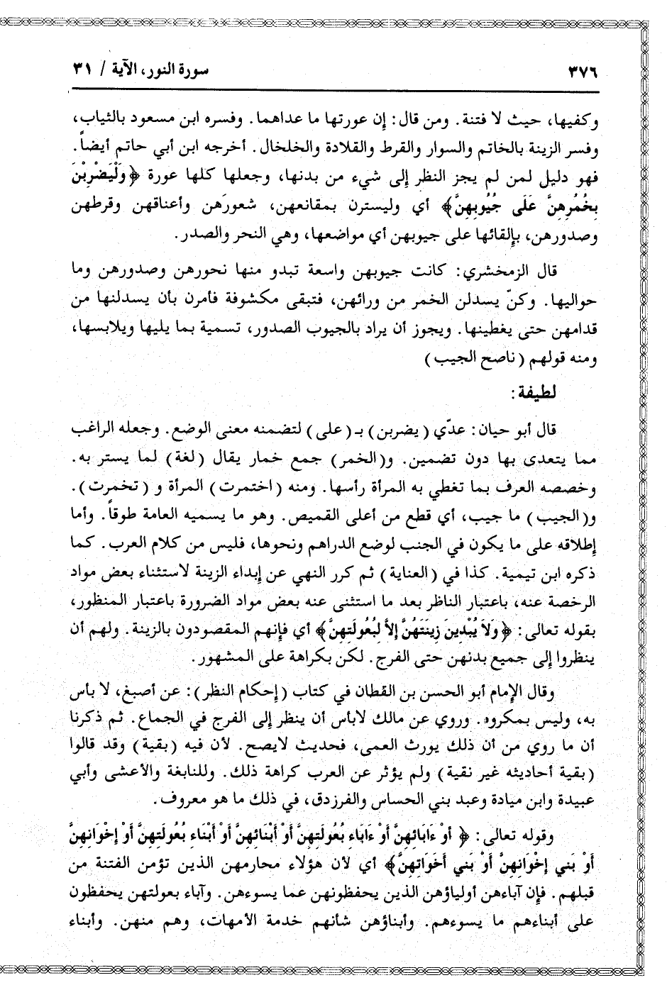 و (الجيب) ما جيب، أي قطع من أعلى القميص. وهو ما يسميه العامة طوقا. وأما إطلاقه على ما يكون في الجنب لوضع الدراهم ونحوها، فليس من كلام العرب. كما ذكره ابن تيمية. كذا في (العناية) ثم كرر النهي عن إبداء الزينة لاستثناء بعض مواد الرخصة عنه، باعتبار الناظر بعد ما استثنى عنه بعض مواد الضرورة باعتبار المنظور، بقوله تعالى: وَلا يُبْدِينَ زِينَتَهُنَّ إِلَّا لِبُعُولَتِهِنَّ أي فإنهم المقصودون بالزينة. ولهم أن ينظروا إلى جميع بدنهن حتى الفرج. لكن بكراهة على المشهور.