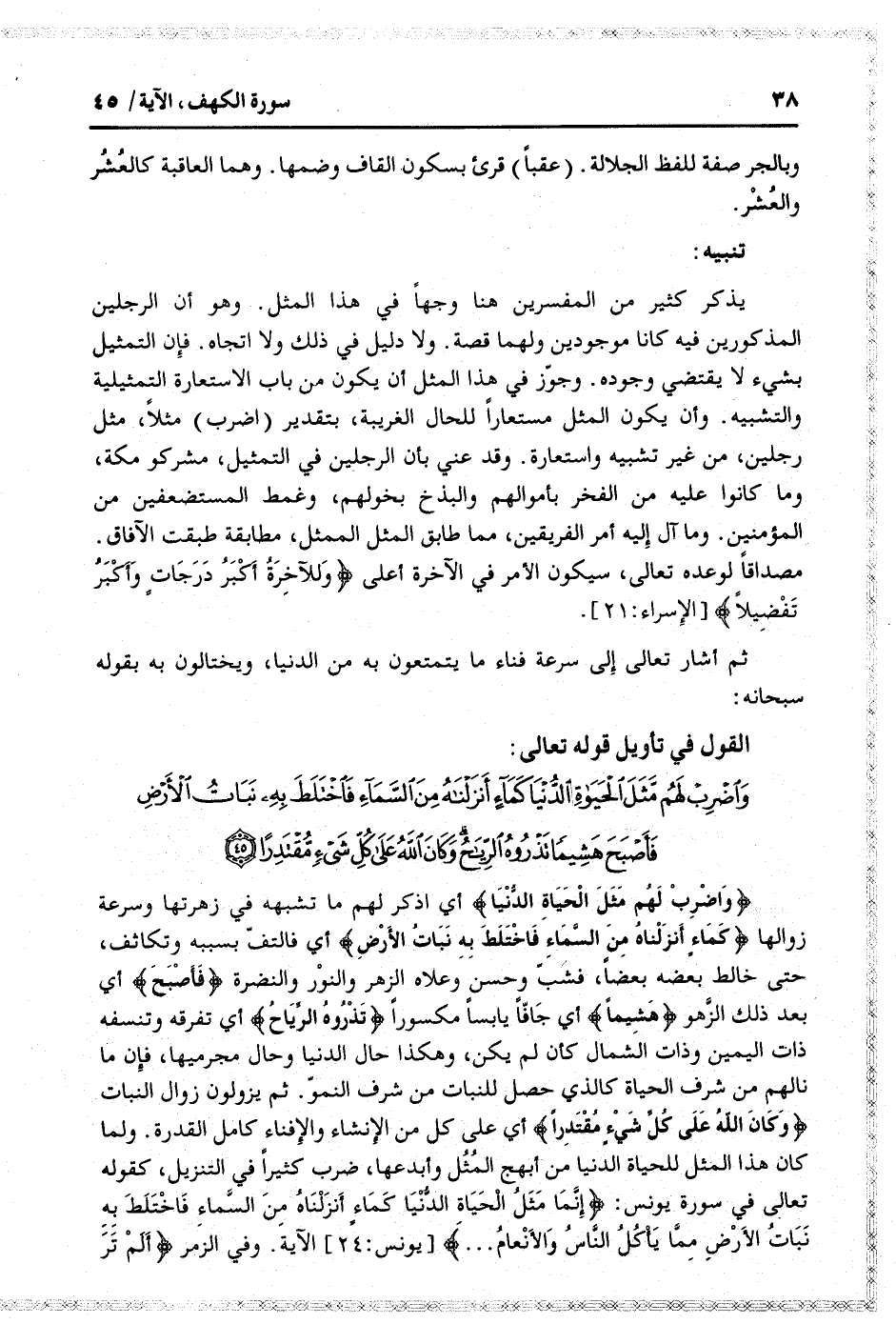 وَاضْرِبْ لَهُمْ مَثَلَ الْحَياةِ الدُّنْيا كَماءٍ أَنْزَلْناهُ مِنَ السَّماءِ فَاخْتَلَطَ بِهِ نَباتُ الْأَرْضِ فَأَصْبَحَ هَشِيماً تَذْرُوهُ الرِّياحُ وَكانَ اللَّهُ عَلى كُلِّ شَيْءٍ مُقْتَدِراً (45)
