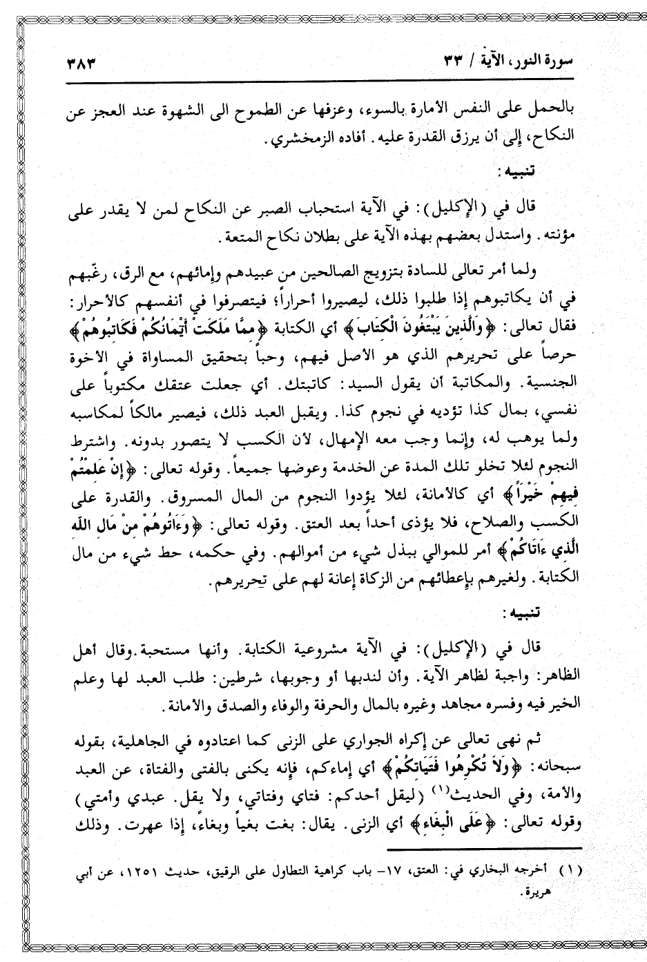 فقال تعالى: وَالَّذِينَ يَبْتَغُونَ الْكِتابَ أي الكتابة مِمَّا مَلَكَتْ أَيْمانُكُمْ فَكاتِبُوهُمْ حرصا على تحريرهم الذي هو الأصل فيهم، وحبا بتحقيق المساواة في الأخوة الجنسية. والمكاتبة أن يقول السيد: كاتبتك. أي جعلت عتقك مكتوبا على نفسي، بمال كذا تؤديه في نجوم كذا. ويقبل العبد ذلك، فيصير مالكا لمكاسبه ولما يوهب له، وإنما وجب معه الإمهال، لأن الكسب لا يتصور بدونه. واشترط النجوم لئلا تخلو تلك المدة عن الخدمة وعوضها جميعا. وقوله تعالى: إِنْ عَلِمْتُمْ فِيهِمْ خَيْراً أي كالأمانة، لئلا يؤدوا النجوم من المال المسروق. والقدرة على الكسب والصلاح، فلا يؤذى أحدا بعد العتق. وقوله تعالى: وَآتُوهُمْ مِنْ مالِ اللَّهِ الَّذِي آتاكُمْ أمر للموالي ببذل شيء من أموالهم. وفي حكمه، حط شيء من مال الكتابة. ولغيرهم بإعطائهم من الزكاة إعانة لهم على تحريرهم.
