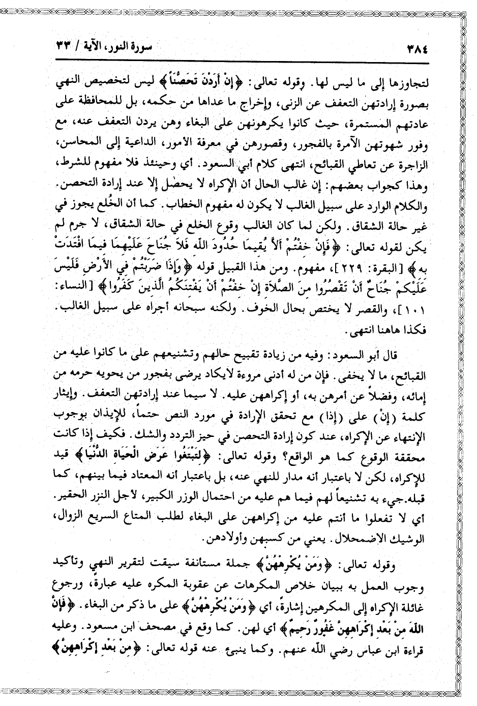 قال أبو السعود: وفيه من زيادة تقبيح حالهم وتشنيعهم على ما كانوا عليه من القبائح، ما لا يخفى. فإن من له أدنى مروءة لا يكاد يرضى بفجور من يحويه حرمه من إمائه، وفضلا عن أمرهن به، أو إكراههن عليه. لا سيما عند إرادتهن التعفف. وإيثار كلمة (إن) على (إذا) مع تحقق الإرادة في مورد النص حتما، للإيذان بوجوب الانتهاء عن الإكراه، عند كون إرادة التحصن في حيز التردد والشك. فكيف إذا كانت محققة الوقوع كما هو الواقع؟ وقوله تعالى: لِتَبْتَغُوا عَرَضَ الْحَياةِ الدُّنْيا قيد للإكراه، لكن لا باعتبار أنه مدار للنهي عنه، بل باعتبار أنه المعتاد فيما بينهم، كما قبله. جيء به تشنيعا لهم فيما هم عليه من احتمال الوزر الكبير، لأجل النزر الحقير.