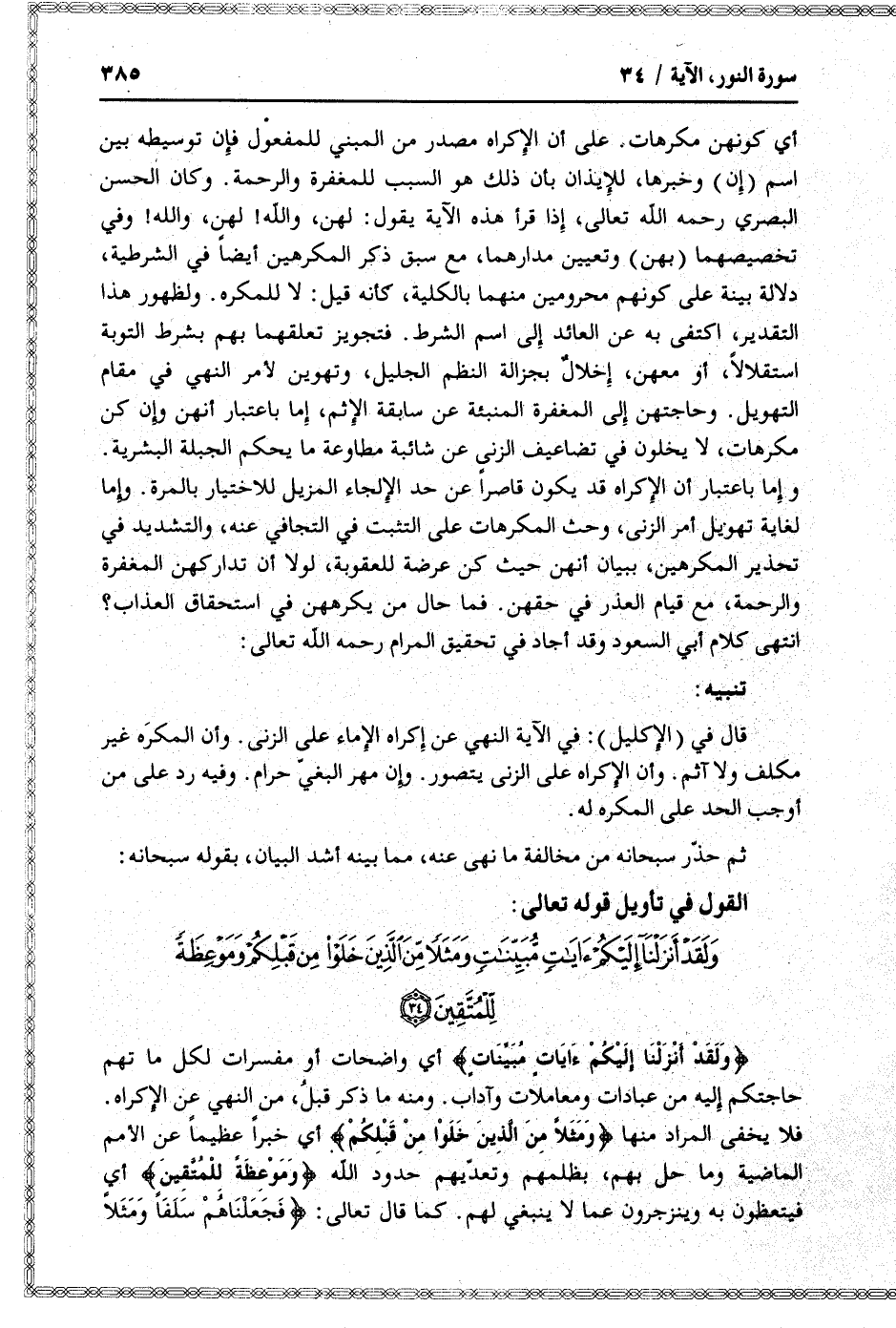 قال في (الإكليل) : في الآية النهي عن إكراه الإماء على الزنى. وأن المكره غير مكلف ولا آثم. وأن الإكراه على الزنى يتصور. وإن مهر البغيّ حرام. وفيه رد على من أوجب الحد على المكره له.