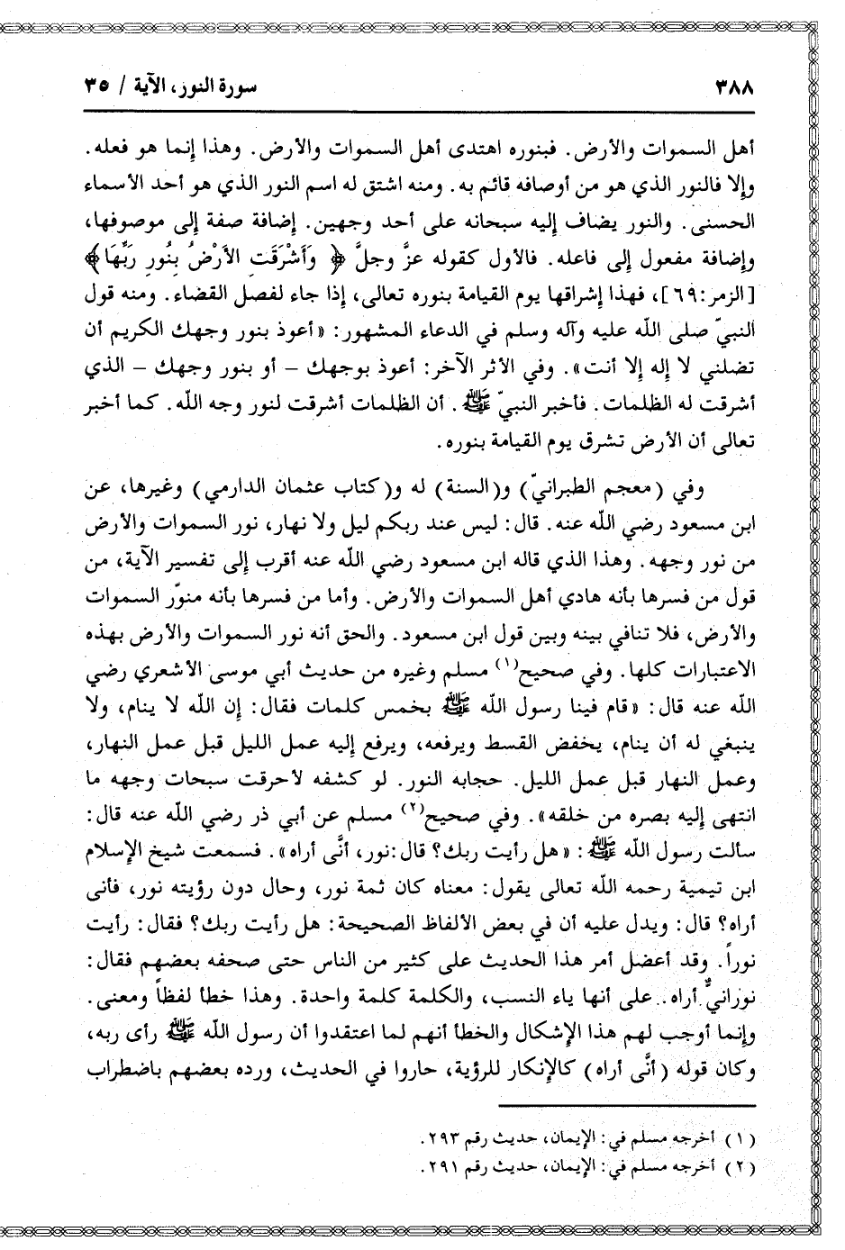 وفي (معجم الطبرانيّ) و (السنة) له و (كتاب عثمان الدارمي) وغيرها، عن ابن مسعود رضي الله عنه. قال: ليس عند ربكم ليل ولا نهار، نور السموات والأرض من نور وجهه. وهذا الذي قاله ابن مسعود رضي الله عنه أقرب إلى تفسير الآية، من قول من فسرها بأنه هادي أهل السموات والأرض. وأما من فسرها بأنه منوّر السموات والأرض، فلا تنافي بينه وبين قول ابن مسعود. والحق أنه نور السموات والأرض بهذه الاعتبارات كلها.