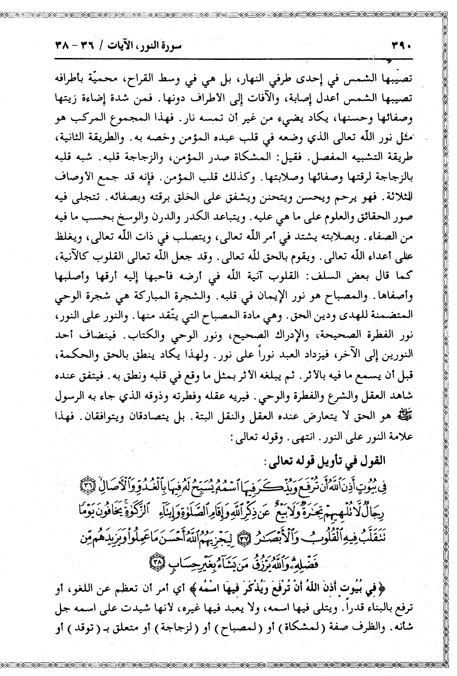 فِي بُيُوتٍ أَذِنَ اللَّهُ أَنْ تُرْفَعَ وَيُذْكَرَ فِيهَا اسْمُهُ يُسَبِّحُ لَهُ فِيها بِالْغُدُوِّ وَالْآصالِ (36) رِجالٌ لا تُلْهِيهِمْ تِجارَةٌ وَلا بَيْعٌ عَنْ ذِكْرِ اللَّهِ وَإِقامِ الصَّلاةِ وَإِيتاءِ الزَّكاةِ يَخافُونَ يَوْماً تَتَقَلَّبُ فِيهِ الْقُلُوبُ وَالْأَبْصارُ (37) لِيَجْزِيَهُمُ اللَّهُ أَحْسَنَ ما عَمِلُوا وَيَزِيدَهُمْ مِنْ فَضْلِهِ وَاللَّهُ يَرْزُقُ مَنْ يَشاءُ بِغَيْرِ حِسابٍ (38)