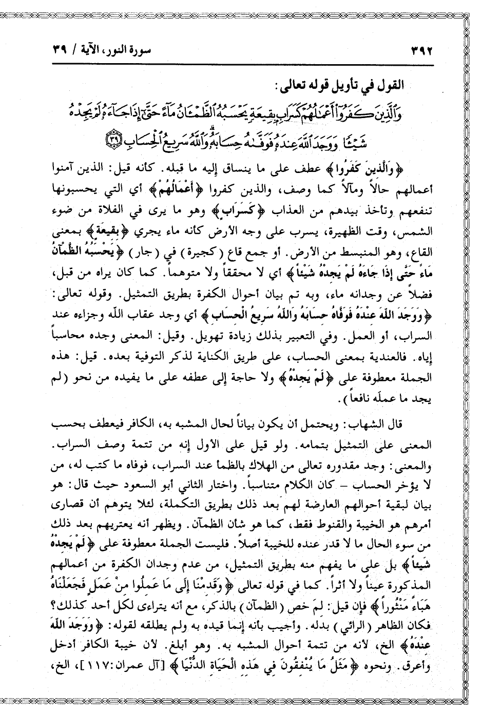 وَالَّذِينَ كَفَرُوا أَعْمالُهُمْ كَسَرابٍ بِقِيعَةٍ يَحْسَبُهُ الظَّمْآنُ ماءً حَتَّى إِذا جاءَهُ لَمْ يَجِدْهُ شَيْئاً وَوَجَدَ اللَّهَ عِنْدَهُ فَوَفَّاهُ حِسابَهُ وَاللَّهُ سَرِيعُ الْحِسابِ (39)