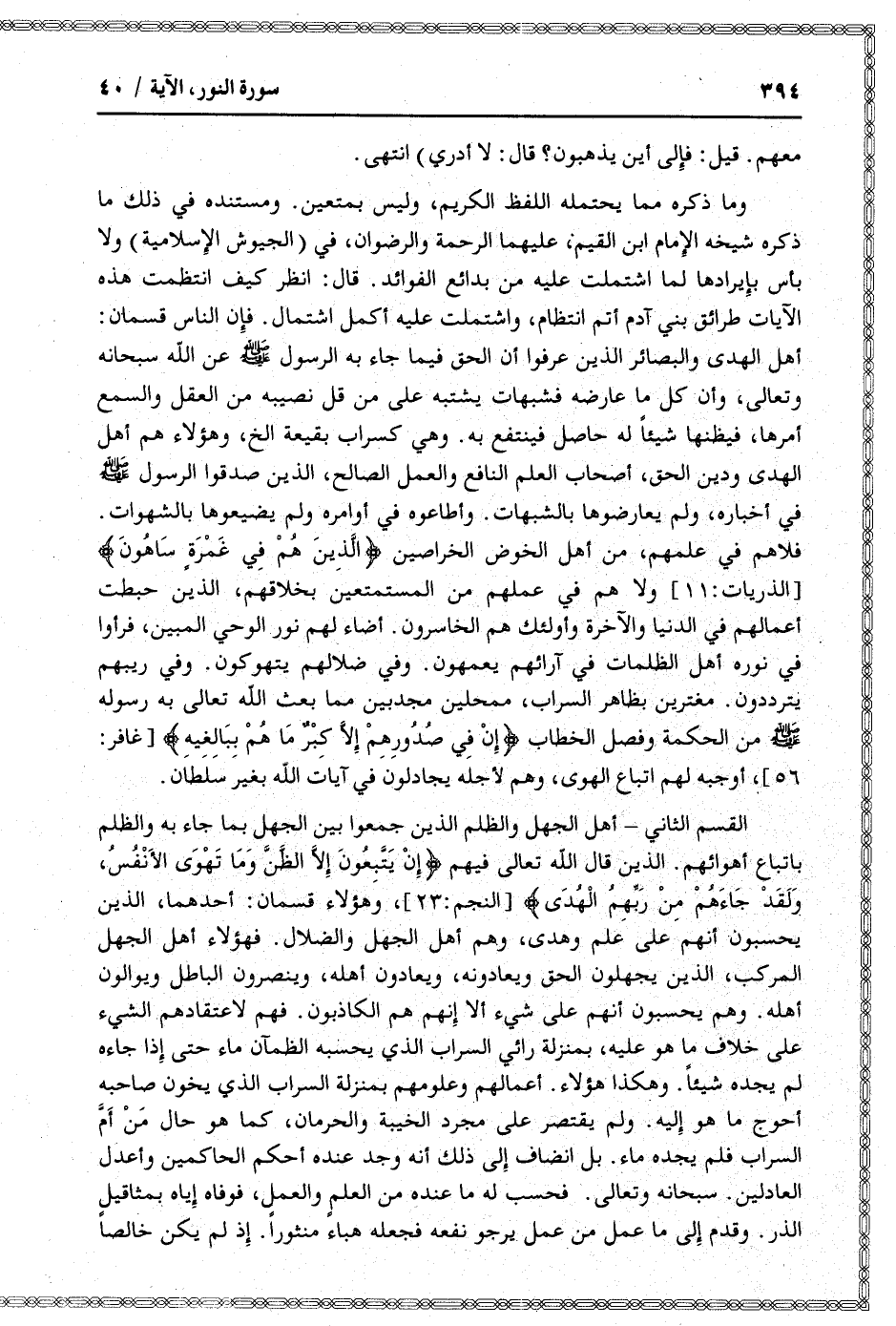القسم الثاني- أهل الجهل والظلم الذين جمعوا بين الجهل بما جاء به والظلم باتباع أهوائهم. الذين قال الله تعالى فيهم إِنْ يَتَّبِعُونَ إِلَّا الظَّنَّ وَما تَهْوَى الْأَنْفُسُ، وَلَقَدْ جاءَهُمْ مِنْ رَبِّهِمُ الْهُدى [النجم: 23] ، وهؤلاء قسمان: أحدهما، الذين يحسبون أنهم على علم وهدى، وهم أهل الجهل والضلال. فهؤلاء أهل الجهل المركب، الذين يجهلون الحق ويعادونه، ويعادون أهله، وينصرون الباطل ويوالون أهله. وهم يحسبون أنهم على شيء ألا إنهم هم الكاذبون. فهم لاعتقادهم الشيء على خلاف ما هو عليه، بمنزلة رائي السراب الذي يحسبه الظمآن ماء حتى إذا جاءه لم يجده شيئا. وهكذا هؤلاء. أعمالهم وعلومهم بمنزلة السراب الذي يخون صاحبه أحوج ما هو إليه. ولم يقتصر على مجرد الخيبة والحرمان، كما هو حال من أمّ السراب فلم يجده ماء. بل انضاف إلى ذلك أنه وجد عنده أحكم الحاكمين وأعدل العادلين. سبحانه وتعالى. فحسب له ما عنده من العلم والعمل، فوفاه إياه بمثاقيل الذر. وقدم إلى ما عمل من عمل يرجو نفعه فجعله هباء منثورا. إذ لم يكن خالصا