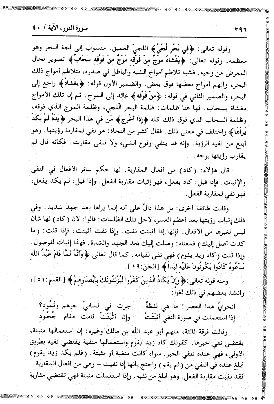 وقوله تعالى: فِي بَحْرٍ لُجِّيٍّ اللجيّ العميق. منسوب إلى لجة البحر وهو معظمه. وقوله تعالى: يَغْشاهُ مَوْجٌ مِنْ فَوْقِهِ مَوْجٌ مِنْ فَوْقِهِ سَحابٌ تصوير لحال المعرض عن وحيه. فشبه تلاطم أمواج الشبه والباطل في صدره، بتلاطم أمواج ذلك البحر، وأنهم أمواج بعضها فوق بعض. والضمير الأول قوله: يَغْشاهُ راجع إلى البحر، والضمير الثاني في قوله: مِنْ فَوْقِهِ عائد إلى الموج. ثم إن تلك الأمواج مغشاة بسحاب. فها هنا ظلمات: ظلمة البحر الّلجي، وظلمة الموج الذي فوقه، وظلمة السحاب الذي فوق ذلك كله إِذا أَخْرَجَ من في هذا البحر يَدَهُ لَمْ يَكَدْ يَراها واختلف في معنى ذلك. فقال كثير من النحاة: هو نفي لمقاربة رؤيتها. وهو أبلغ من نفيه الرؤية. وإنه قد ينفي وقوع الشيء ولا تنفى مقاربته. فكأنه قال لم يقارب رؤيتها بوجه.
