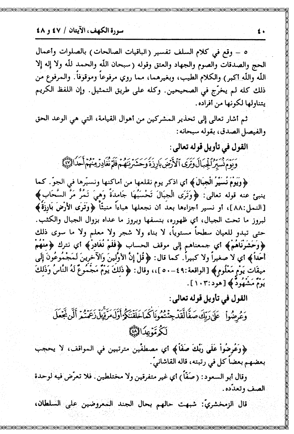 حتى تبدو للعيان سطحا مستويا، لا بناء ولا شجر ولا معلم ولا ما سوى ذلك وَحَشَرْناهُمْ أي جمعناهم إلى موقف الحساب فَلَمْ نُغادِرْ أي نترك مِنْهُمْ أَحَداً أي لا صغيرا ولا كبيرا. كما قال: قُلْ إِنَّ الْأَوَّلِينَ وَالْآخِرِينَ لَمَجْمُوعُونَ إِلى مِيقاتِ يَوْمٍ مَعْلُومٍ [الواقعة: 49- 50] ،، وقال: ذلِكَ يَوْمٌ مَجْمُوعٌ لَهُ النَّاسُ وَذلِكَ يَوْمٌ مَشْهُودٌ [هود: 103] .
