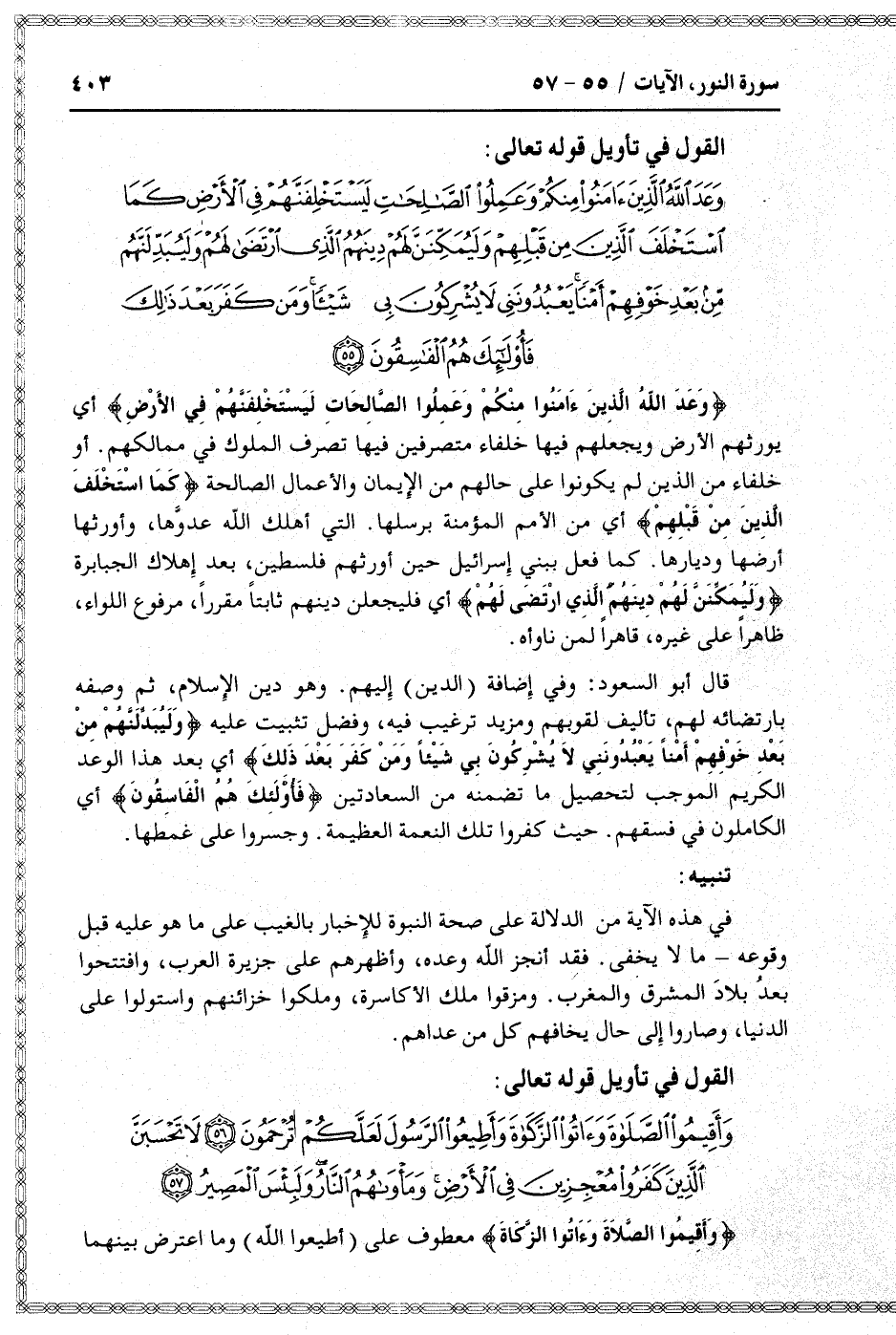 وَعَدَ اللَّهُ الَّذِينَ آمَنُوا مِنْكُمْ وَعَمِلُوا الصَّالِحاتِ لَيَسْتَخْلِفَنَّهُمْ فِي الْأَرْضِ كَمَا اسْتَخْلَفَ الَّذِينَ مِنْ قَبْلِهِمْ وَلَيُمَكِّنَنَّ لَهُمْ دِينَهُمُ الَّذِي ارْتَضى لَهُمْ وَلَيُبَدِّلَنَّهُمْ مِنْ بَعْدِ خَوْفِهِمْ أَمْناً يَعْبُدُونَنِي لا يُشْرِكُونَ بِي شَيْئاً وَمَنْ كَفَرَ بَعْدَ ذلِكَ فَأُولئِكَ هُمُ الْفاسِقُونَ (55)