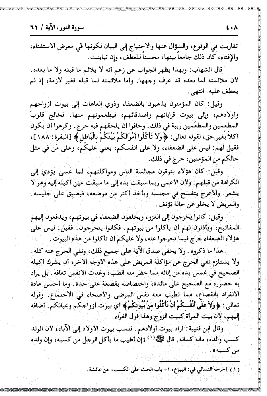 ولا يستلزم نفي الحرج عن مؤاكلة المريض على هذه الأوجه الأخر، أن يشرك أكيله الصحيح في غمس يده من إنائه مما حظر منه الطب، وغدت الأنفس تعافه. بل يراد به حضوره مع الصحيح على مائدة، واختصاصه بقصعة على حدة. وما أحسن عادة الانفراد بالقصاع، مما تطيب معه نفس المرضى والأصحاء في الاجتماع. وقوله تعالى: وَلا عَلى أَنْفُسِكُمْ أَنْ تَأْكُلُوا مِنْ بُيُوتِكُمْ أي بيوت أزواجكم وعيالكم. أضافه إليهم، لأن بيت المرأة كبيت الزوج وهذا قول الفرّاء.