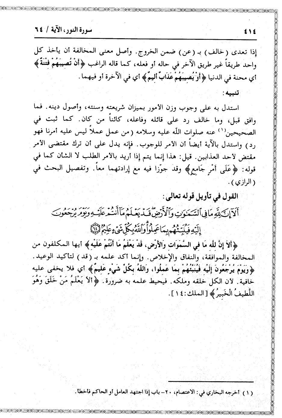 إذا تعدى (خالف) ب (عن) ضمن الخروج. وأصل معنى المخالفة أن يأخذ كل واحد طريقا غير طريق الآخر في حاله أو فعله، كما قاله الراغب أَنْ تُصِيبَهُمْ فِتْنَةٌ أي محنة في الدنيا أَوْ يُصِيبَهُمْ عَذابٌ أَلِيمٌ أي في الآخرة أو فيهما.